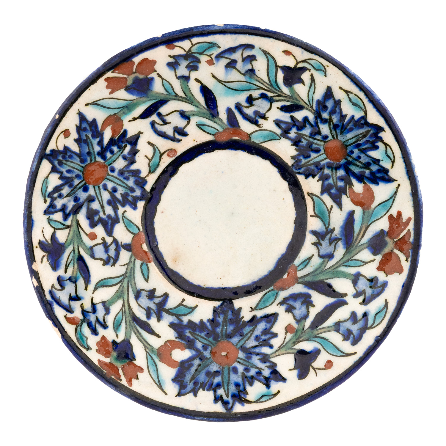Τιμή εκτίμησης: € 600 - 800Λευκός πηλός με επίχρισμα και πυκνός άνθινος διάκοσμος κάτω από διαφανή λαμπερή εφυάλωση.