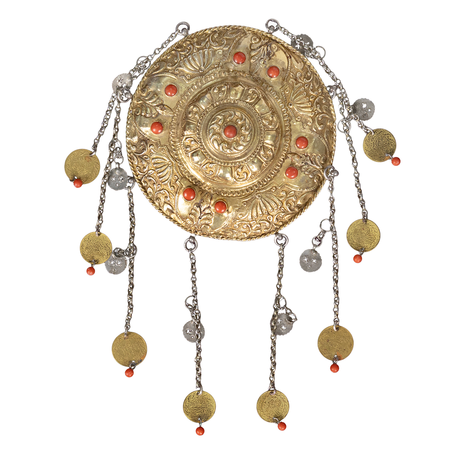 Τιμή εκτίμησης: € 700 - 900Στρογγυλό κόσμημα στολισμού γυναικείου κεφαλόδεσμου. Σφυρήλατος διάκοσμος με μπαρόκ μοτίβα και επίθετα σφαιρικά κοράλλια στερεωμένα με καστόνια. Φέρει κρεμασίδια από οθωμανικά νομίσματα και οδοντωτά κυκλικά ελάσματα με διάτρητους σταυρούς.