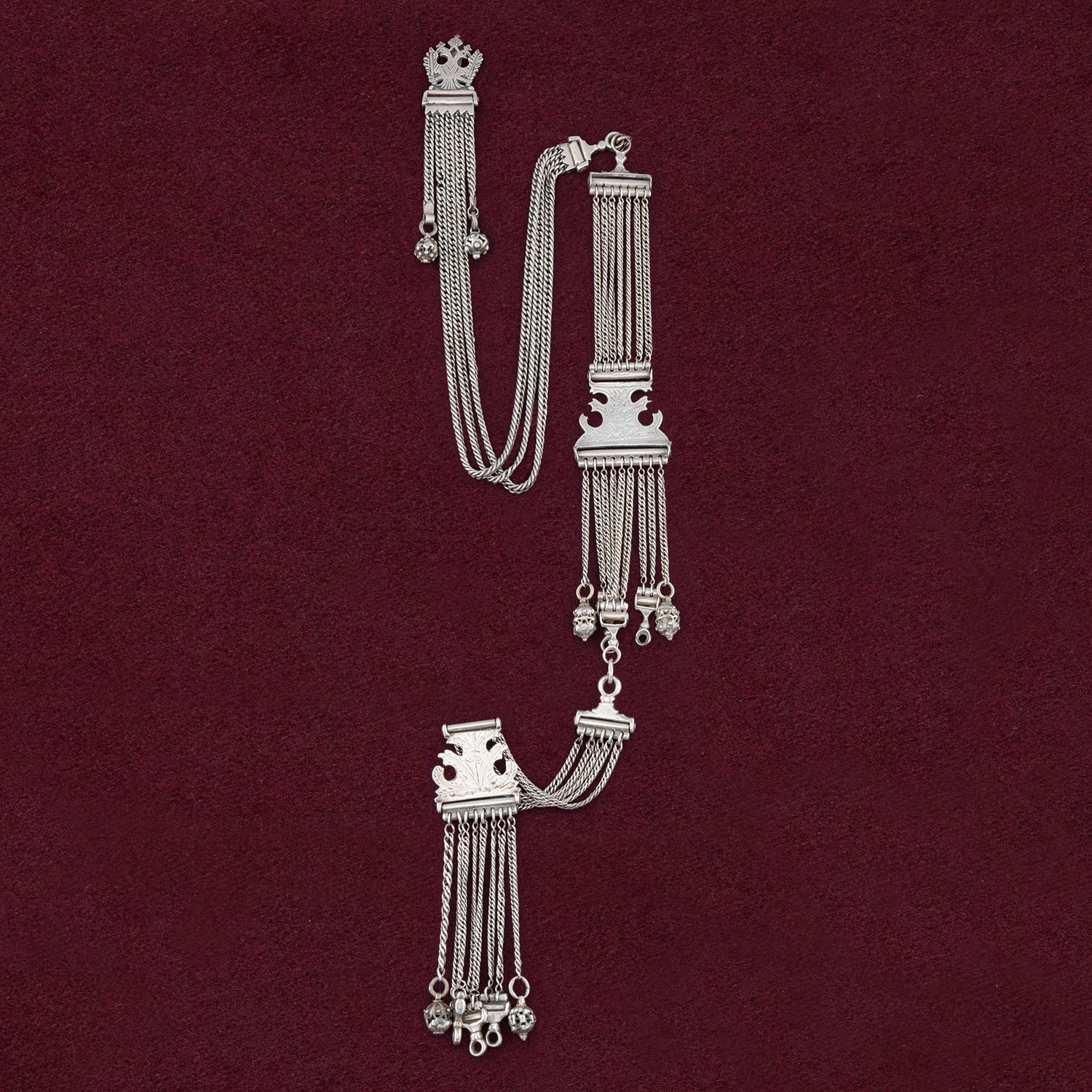 Τιμή εκτίμησης: € 2.000 - 3.000Οι δύο πλάκες με εγχάρακτο γραμμικό διάκοσμο φέρουν σφραγίδες σουλτανικής τουρά και μετάλλου 900 βαθμών. Το άγκιστρο στερέωσης με μορφή δικέφαλου αετού. Φέρει διακοσμητικά κρεμασίδια και διάφορες απολήξεις ανάρτησης για κουρδιστήρι,προσωπικές σφραγίδες και διάφορα αλλά εξαρτήματα.