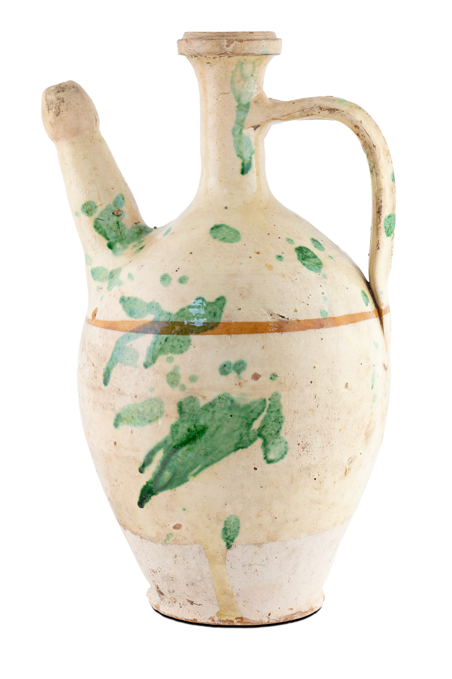Τιμή εκτίμησης: € 400 - 600Χαρακτηριστικός τύπος τσανακαλιώτικου κανατιού με φαλλόμορφη προχοή. Διάκοσμος με πράσινα ρέοντα χρώματα και πιτσιλιές πάνω σε λευκό κάμπο. Στο σώμα τριχοειδής ρωγμή περίπου 14 εκ.