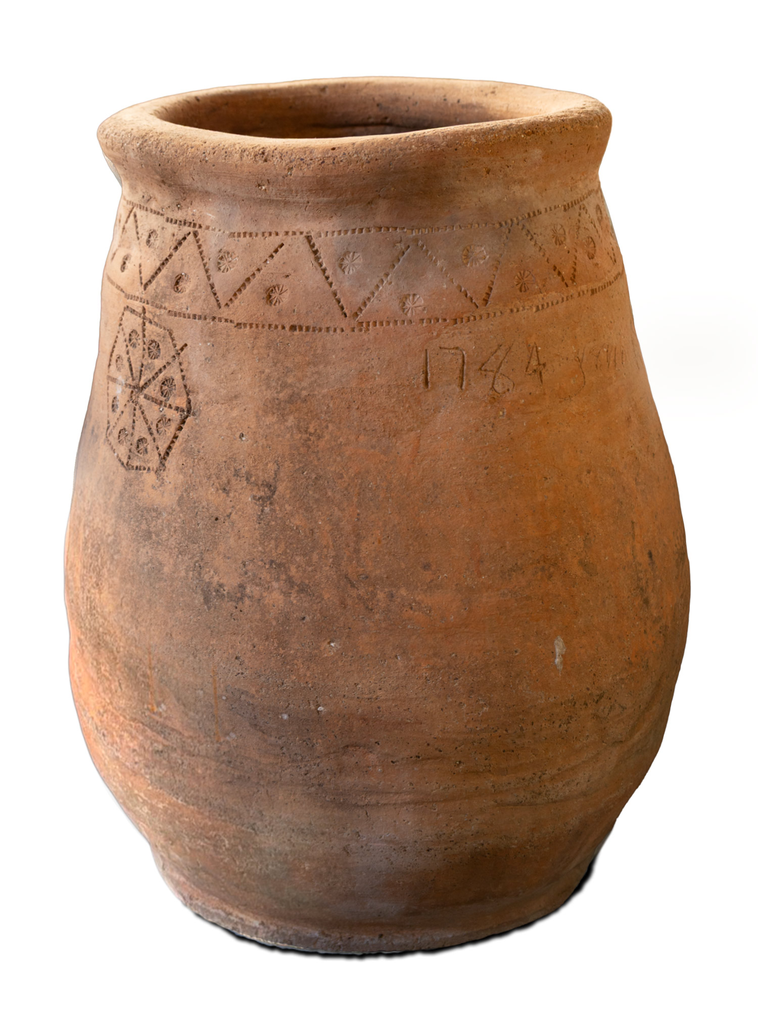 Τιμή εκτίμησης: € 4.000 - 6.000Πήλινο πιθάρι κατασκευασμένο στην περίοδο της μεγάλης ακμής της Χίου, που διακόπηκε από τη σφαγή του 1822. Εμπίεστος διάκοσμος με χρήση οδοντωτής γλυφίδας και σφραγίδων. Περιμετρικά, κάτω από το χείλος, αναπτύσσεται διακοσμητική ζώνη με τριγωνικά σχήματα και ρόδακες. Ακτινωτό σχήμα με ενδιάμεσους ρόδακες περικλείεται σε πολυγωνικό «μενταγιόν». Στο σώμα εγχάρακτη επι γραφή «1784 Ιουνιο 13».