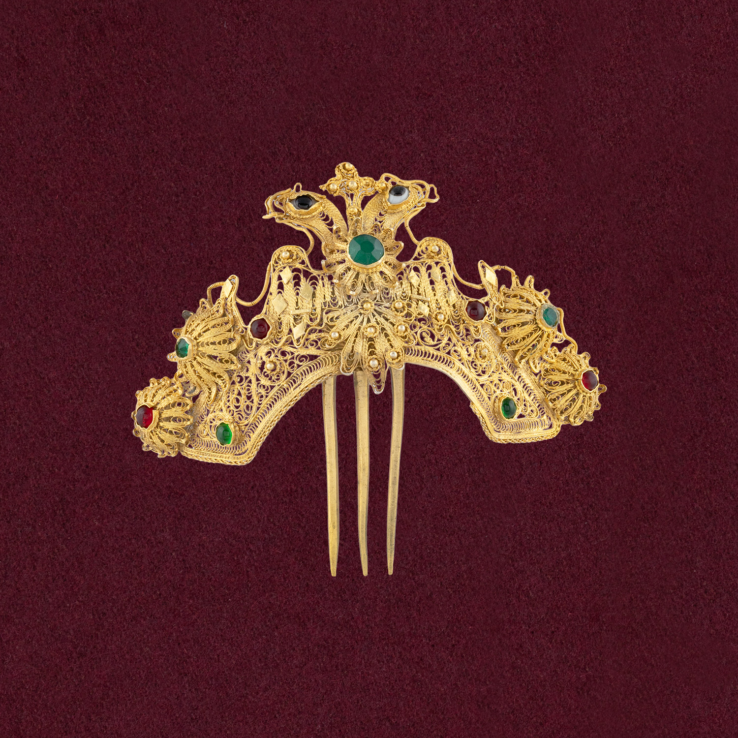 Περίτεχνος διάτρητος συρματερός διάκοσμος και ένθετες χρωματιστές και ημιπολύτιμες πέτρες.