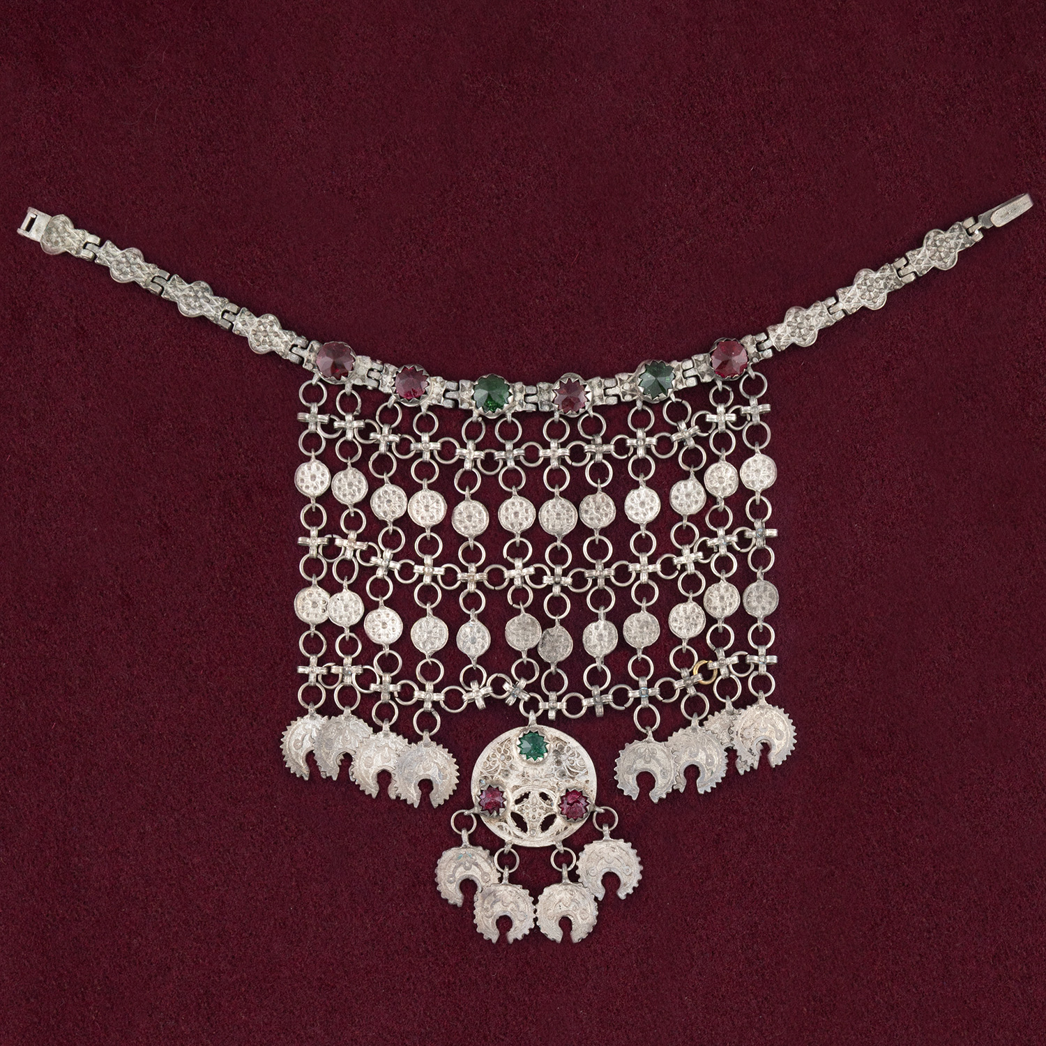 Τιμή εκτίμησης: € 1.500 - 2.000Κόσμημα λαιμού από το Ρουμλούκι, το βορειοανατολικό τμήμα της πεδιάδας της Ημαθίας. Αποτελείται από χυτά πλακίδια, δουλεμένα με την κοκκιδωτή τεχνική και στολισμένα με γυάλινες πέτρες. Από αυτά εξαρτάται πλέγμα, που καλύπτει και στολίζει το στέρνο, καμωμένο από ρόδακες, συνεχόμενους σχηματοποιημένους σταυρούς και πεταλοειδή κρεμασίδια, με απόληξη σε ένα κρεμαστό κεντρικό δισκάριο με χρωματιστές πέτρες.