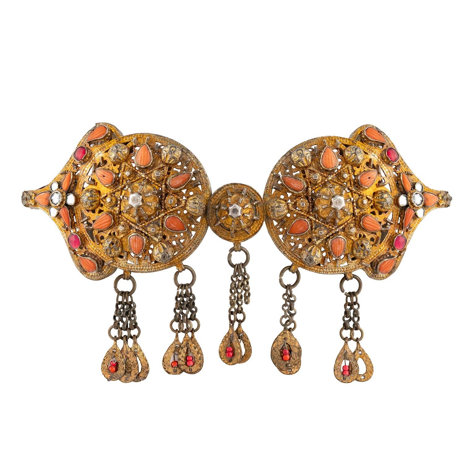 Τιμή εκτίμησης: € 2.600 - 3.000Αποτελείται από κυρτές κυκλικές πλάκες με σχηματοποιημένα στέμματα στις άκρες. Χυτός συρματερός διάκοσμος με επίθετα αμυγδαλόσχημα κοράλλια και ημιπολύτιμες πέτρες. Όλες οι πλάκες φέρουν κρεμασίδια και οι δύο πλευρικές αποτροπαϊκή εξάλφα στο κέντρο.