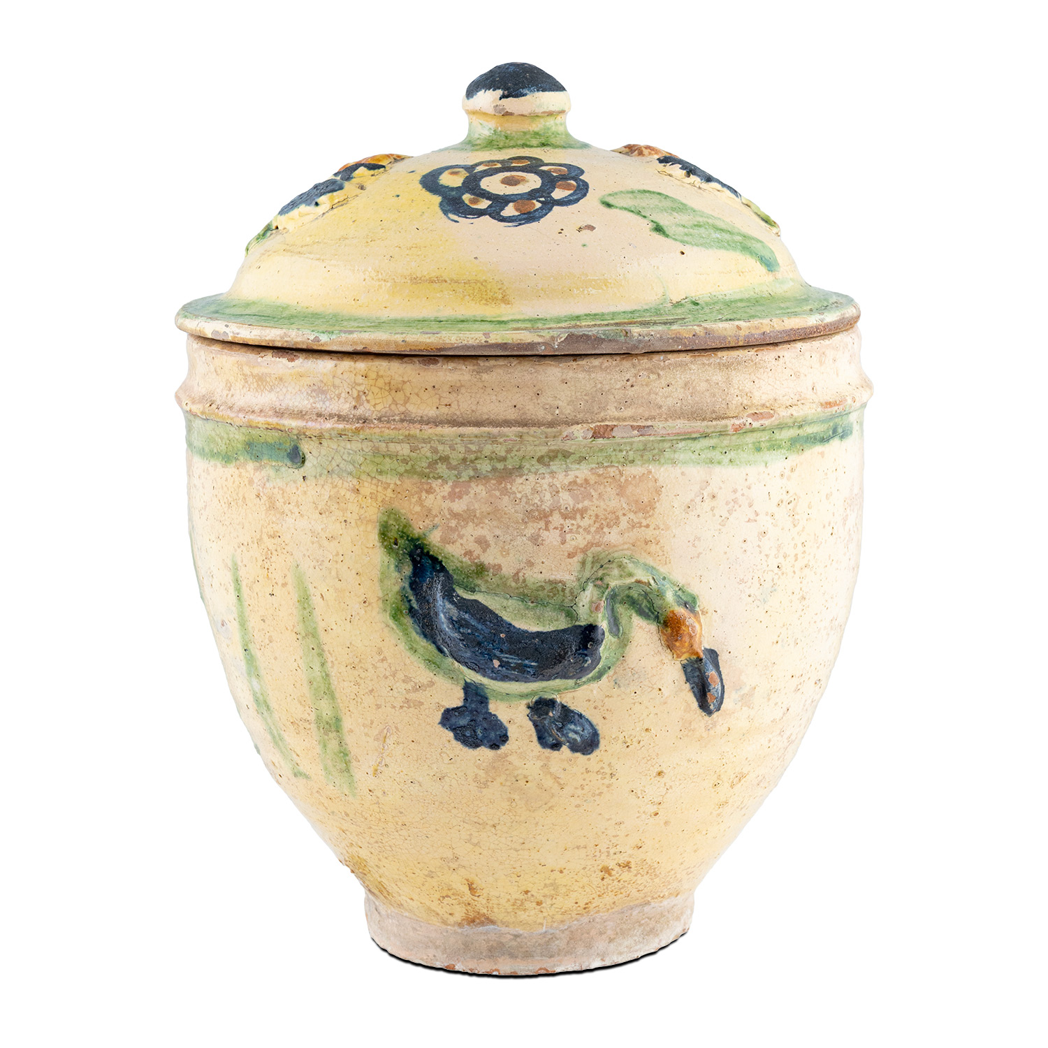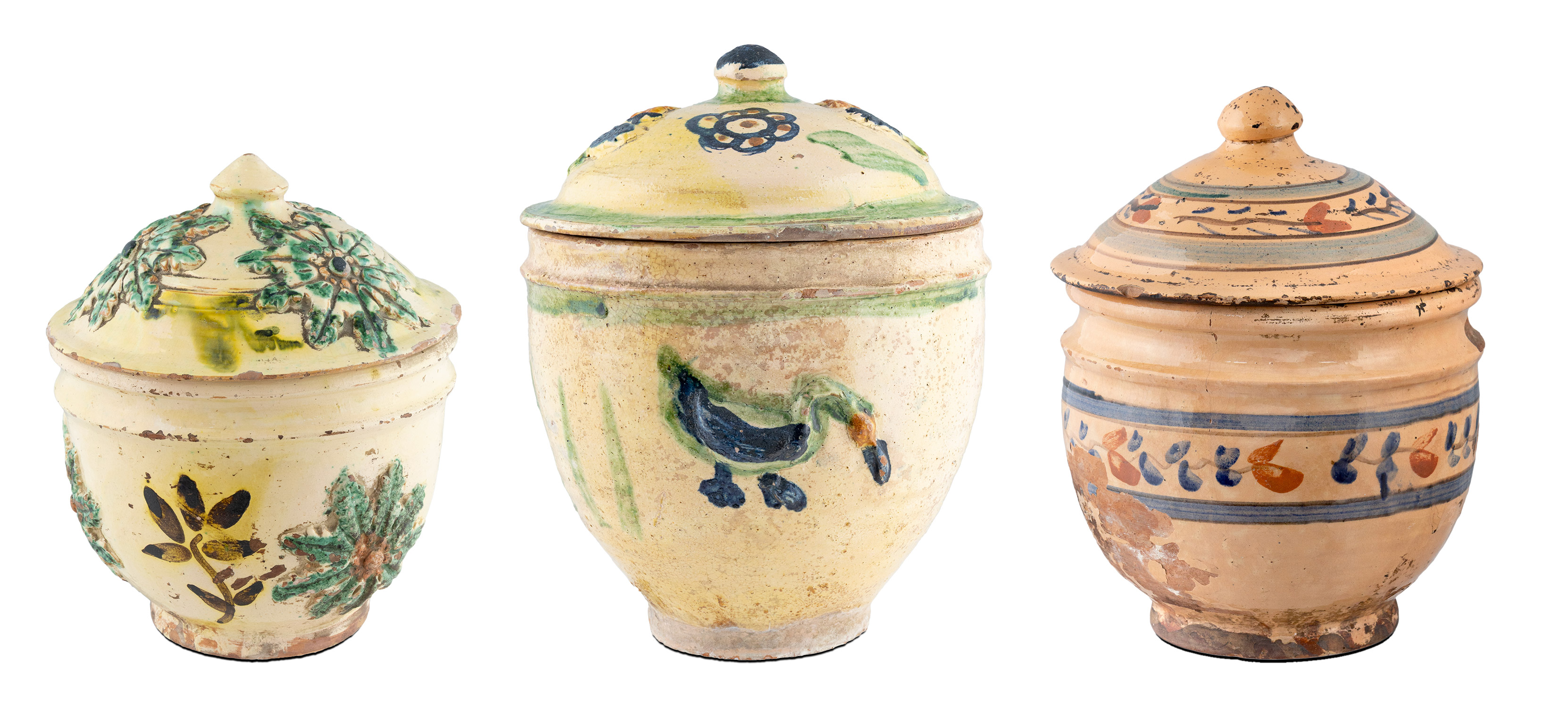 Τιμή εκτίμησης: € 1.000 - 1.500Χαρακτηριστικά σαμιώτικα αγγεία με καπάκι για την αποθήκευση οσπρίων, γλυκισμάτων και άλλων τροφών. Τα δύο φέρουν επίθετο διάκοσμο με πουλιά και ροζέτες (δεκαετία 1930). Το τρίτο χρονολογείται στη δεκαετία του 1960, φέρει περιμετρικές ταινίες με γραπτό φυτικό διάκοσμο και έχει αρκετές απολεπίσεις στο σώμα.