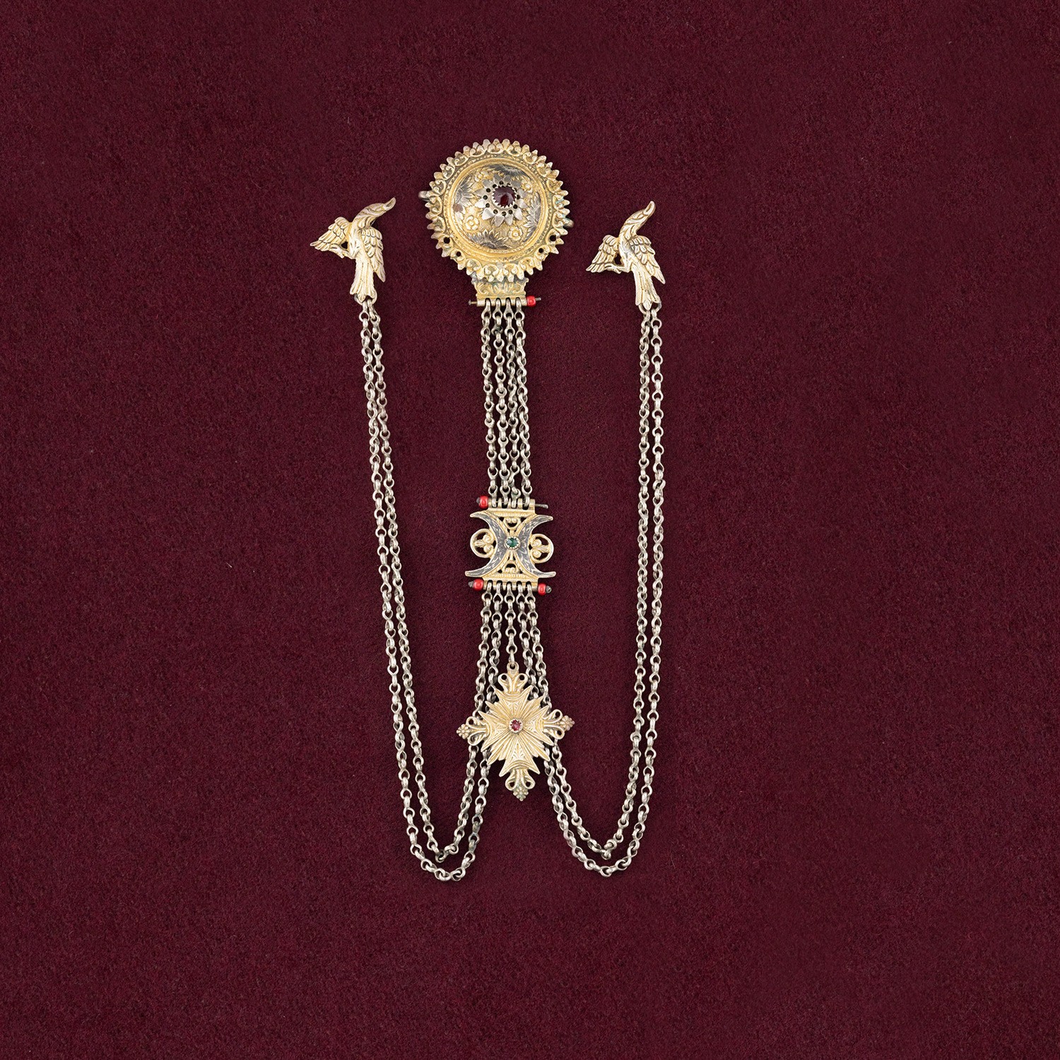 Τιμή εκτίμησης: € 1.400 - 1.600Αποτελείται από δύο χυτές πλάκες ενωμένες μεταξύ τους με τέσσερεις σειρές αλυσίδες που καταλήγουν σε αετόμορφους γάντζους.Διάκοσμος με χρωματιστές πέτρες και σαβατλίδικα σχέδια. Από τη μία πλάκα κρέμεται σταυρός.