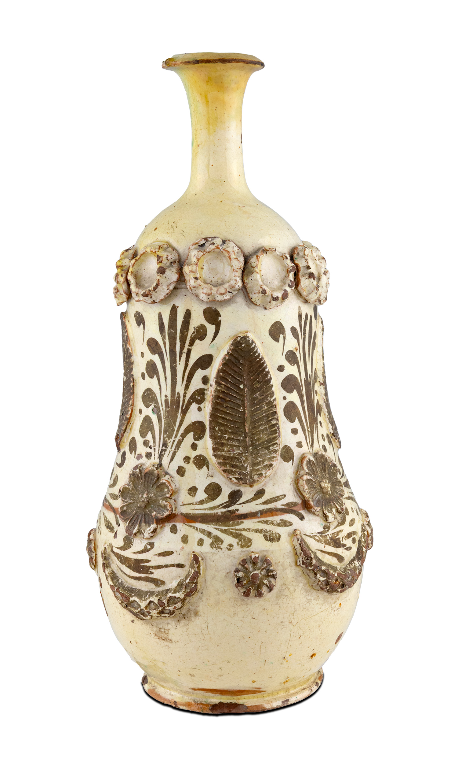Τιμή εκτίμησης: € 1.000 - 1.200Κόκκινος πηλός με υπόλευκο επίχρισμα. Στο σώμα εξαιρετικά διατηρημένος γραπτός φυλλόμορφος διάκοσμος με άψητο χρυσό χρώμα πάνω από την εφυάλωση που συνδυάζεται με επίθετα διακοσμητικά φύλλα, γιρλάντες και ροζέτες.