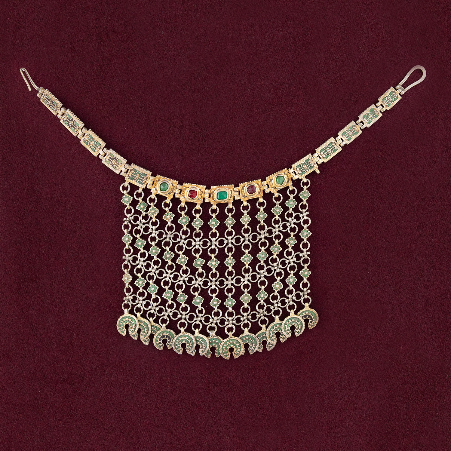 Τιμή εκτίμησης: € 2.000 - 3.000Χαρακτηριστικό ασημένιο επίχρυσο κόσμημα λαιμού από τον Γιδά (Αλεξάνδρεια) Ημαθίας. Ταινία από χυτά πλακίδια, δουλεμένα με κοκκιδωτή τεχνική και διακοσμημένα με σμάλτα και ημιπολύτιμες πέτρες. Από τα πλακίδια εξαρτάται πλέγμα που καλύπτει και στολίζει το στέρνο, καμωμένο από επισμαλτωμένα άνθη, σχηματοποιημένους σταυρούς και πέταλα με πράσινα σμάλτα στην απόληξή του.