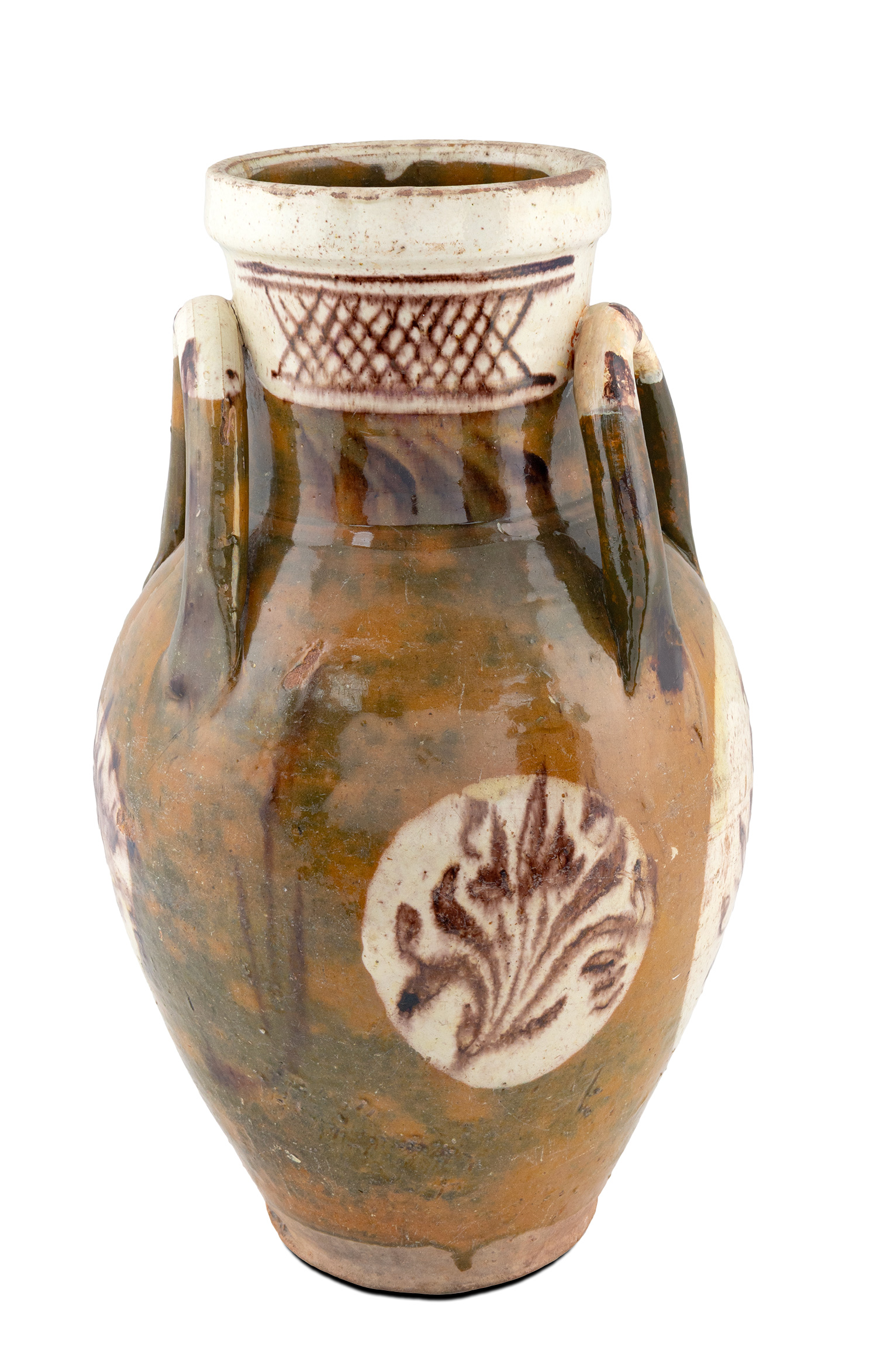 Τιμή εκτίμησης: € 1.500 - 2.000Κόκκινος πηλός με υπόλευκο επίχρισμα και άχρωμη εφυάλωση. Στο βολβοειδές σώμα γραπτός διάκοσμος με τουλίπες, που αναπτύσσονται σε τρία υπόλευκα μετάλλια. Ο λαιμός πλαισιώνεται από κατα κόρυφες λαβές και είναι διακοσμημένος με καφασωτό πλέγμα και φυλλωτά.