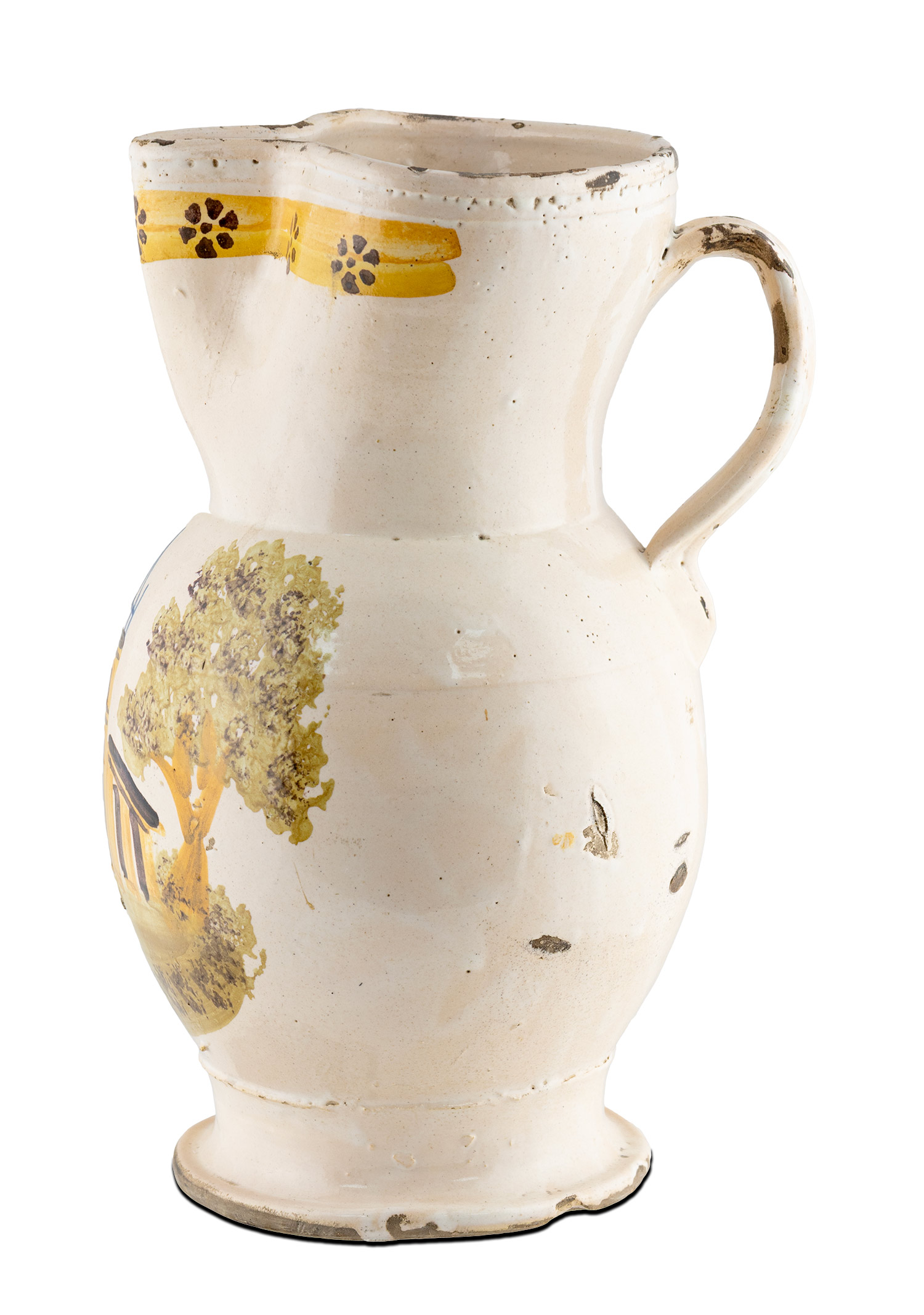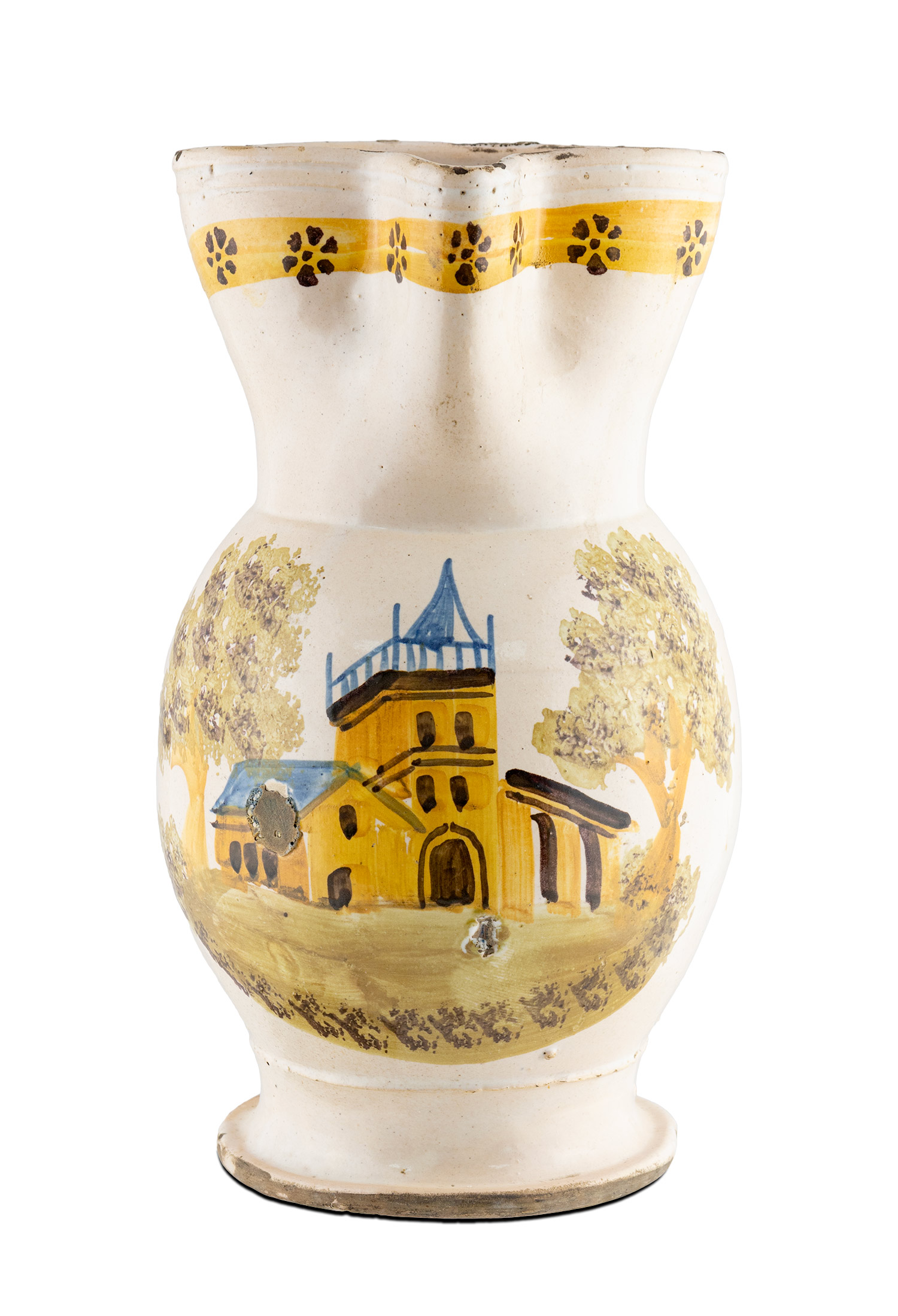 Τιμή εκτίμησης: € 1.200 - 1.600Στο σώμα απεικονίζονται μασσερίες (masserie), οχυρωμένες αγροικίες στη Νότια Ιταλία (ιδίως στην Απουλία), που ανήκαν σε φέουδα ή μεγάλες ιδιοκτησίες και προορίζονταν για να προστατεύουν τους εργάτες γης και τις σοδειές του ιδιοκτήτη από τις εξεγέρσεις των χωρικών και τους ληστές. Το ένα κανάτι φέρει επισκευή στο πλαϊνό του τριφυλλόσχημου στομίου χωρίς να επηρεάζεται το θέμα.