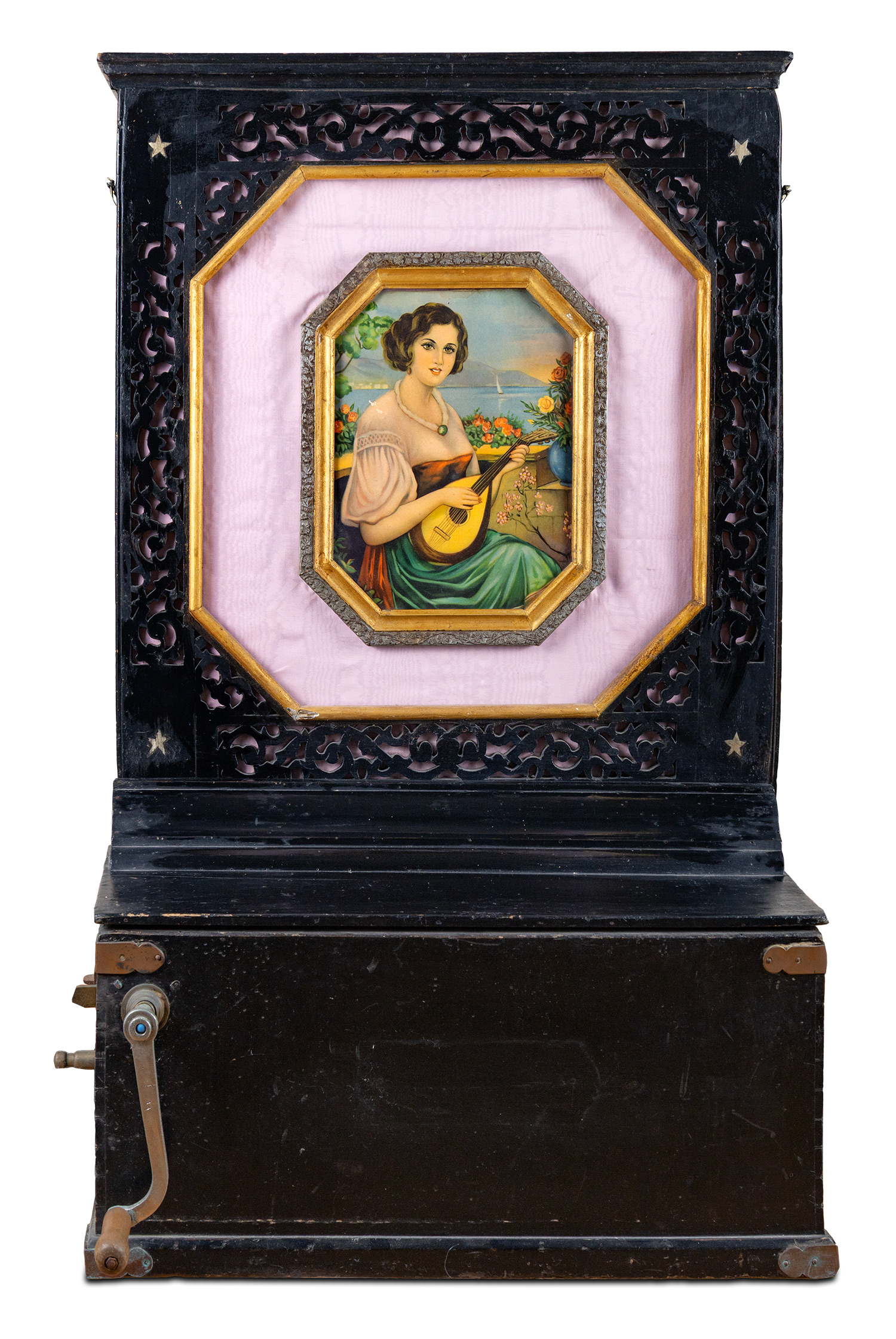 Τιμή εκτίμησης: € 3.000 - 4.000Στο κέντρο του πάνω τμήματος χρωμολιθογραφία με κοπέλα που παίζει μαντολίνο. Στην πίσω πλευρά ταμπέλα του κατασκευαστή “Z. DICRAN – CONSTANTINOPLE”.