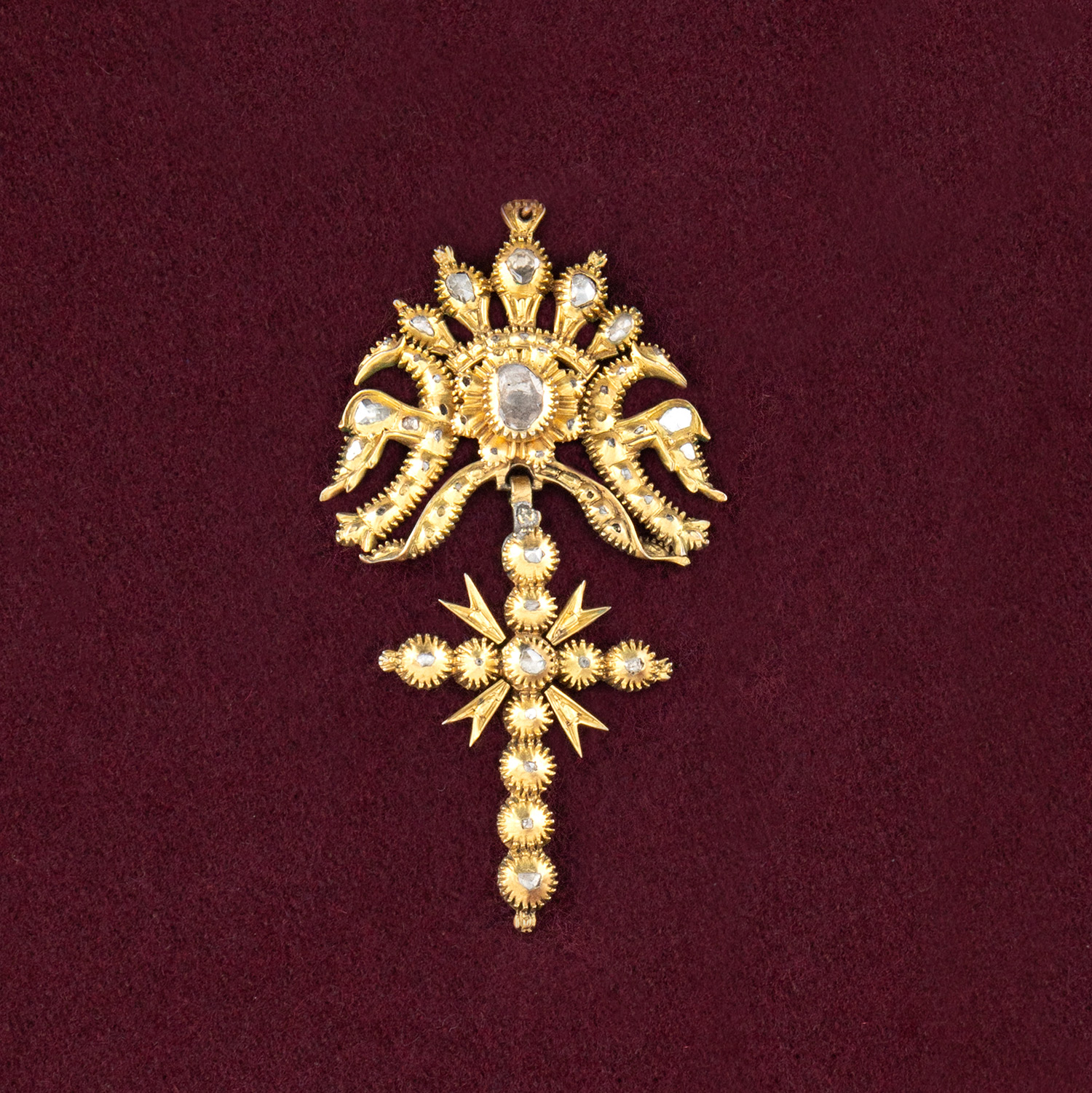 Νυφιάτικος αστικός σταυρός με στέμμα. Ασημόχρυσο κράμα επιχρυσωμένο με old cut διαμάντια