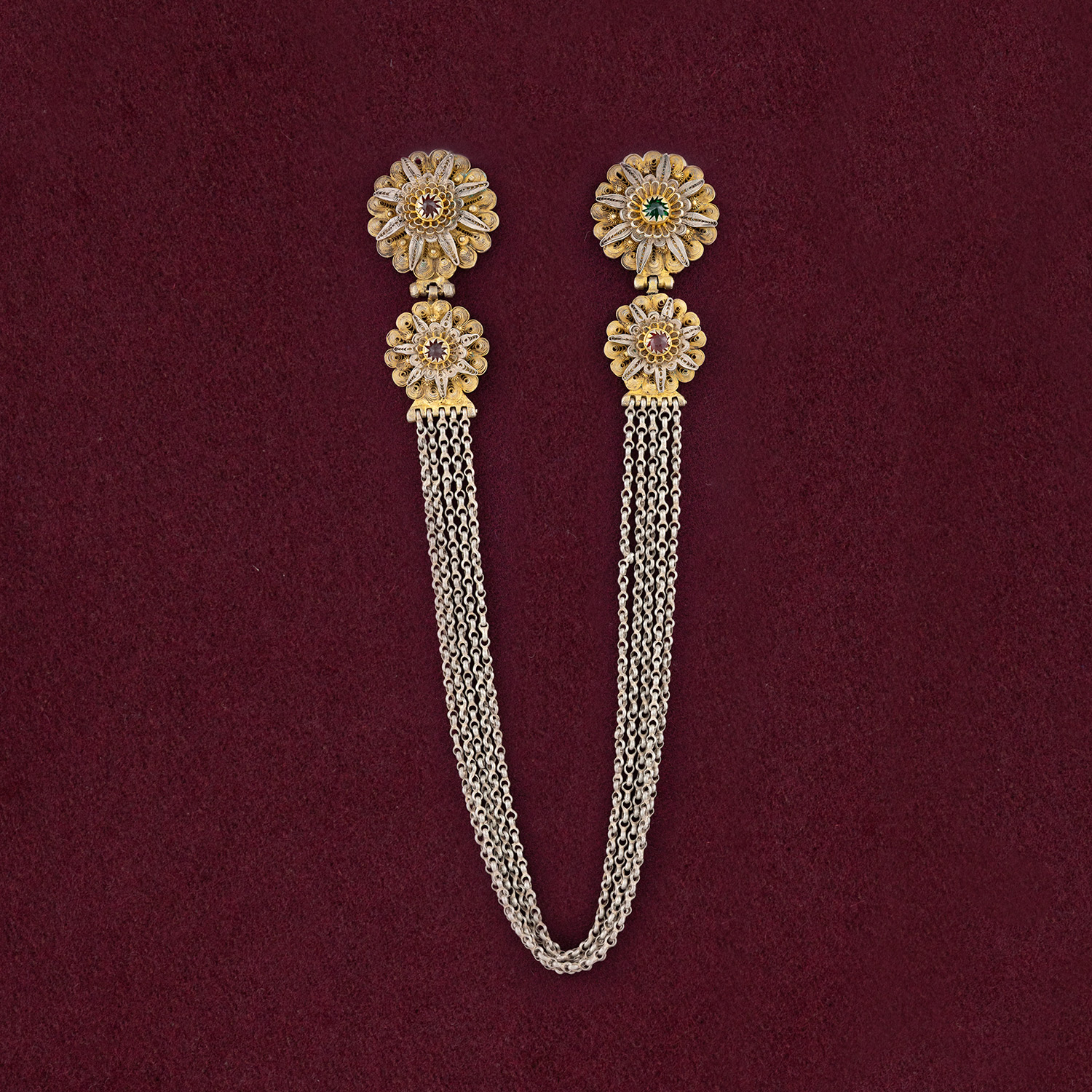 Τιμή εκτίμησης: € 1.200 - 1.600Γνωστό ως κεφαλόκομπτσα της καραγκούνικης φορεσιάς, αποτελείται από διπλές ροζέτες που ενώνονται με αλυσίδες. Περίτεχνος διάτρητος συρματερός διάκοσμος με ημιπολύτιμες πέτρες στο κέντρο. Τα ακτινωτά άνθη σε κάθε ροζέτα δεν έχουν επιχρυσωθεί δίνοντας την αίσθηση της πολυχρωμίας.