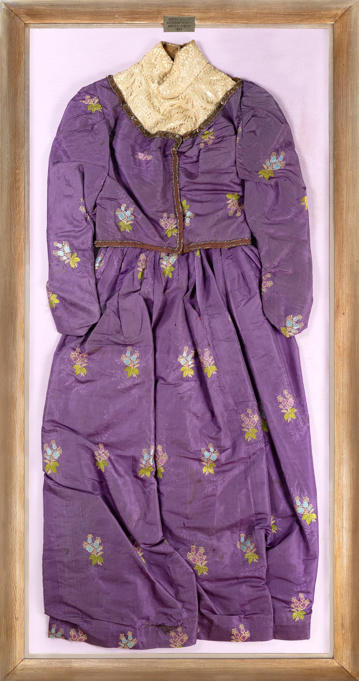 Τιμή εκτίμησης: € 1.000 - 1.500Μετάξι, διακοσμημένο με άνθινα μοτίβα από χρυσοκλωστές. Η χρήση τους σε ενδύματα ήταν δείγμα εξουσίας και πολυτέλειας. Ο γιακάς από περίτεχνο μικρασιάτικο κοπανέλι (χειροποίητη δαντέλα).