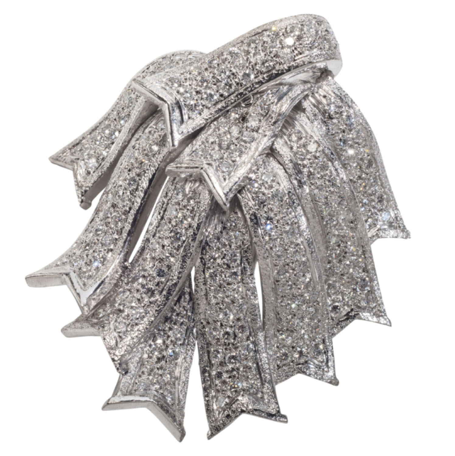 Art-Deco σε λευκόχρυσο. Κεντρικό στρογγυλό διαμάντι παλαιάς κοπής (ρώσικο τρόχισμα) διακοσμημένο με διαμάντια ακανόνιστου σχήματος παλαιάς κοπής σε λευκόχρυσο.
