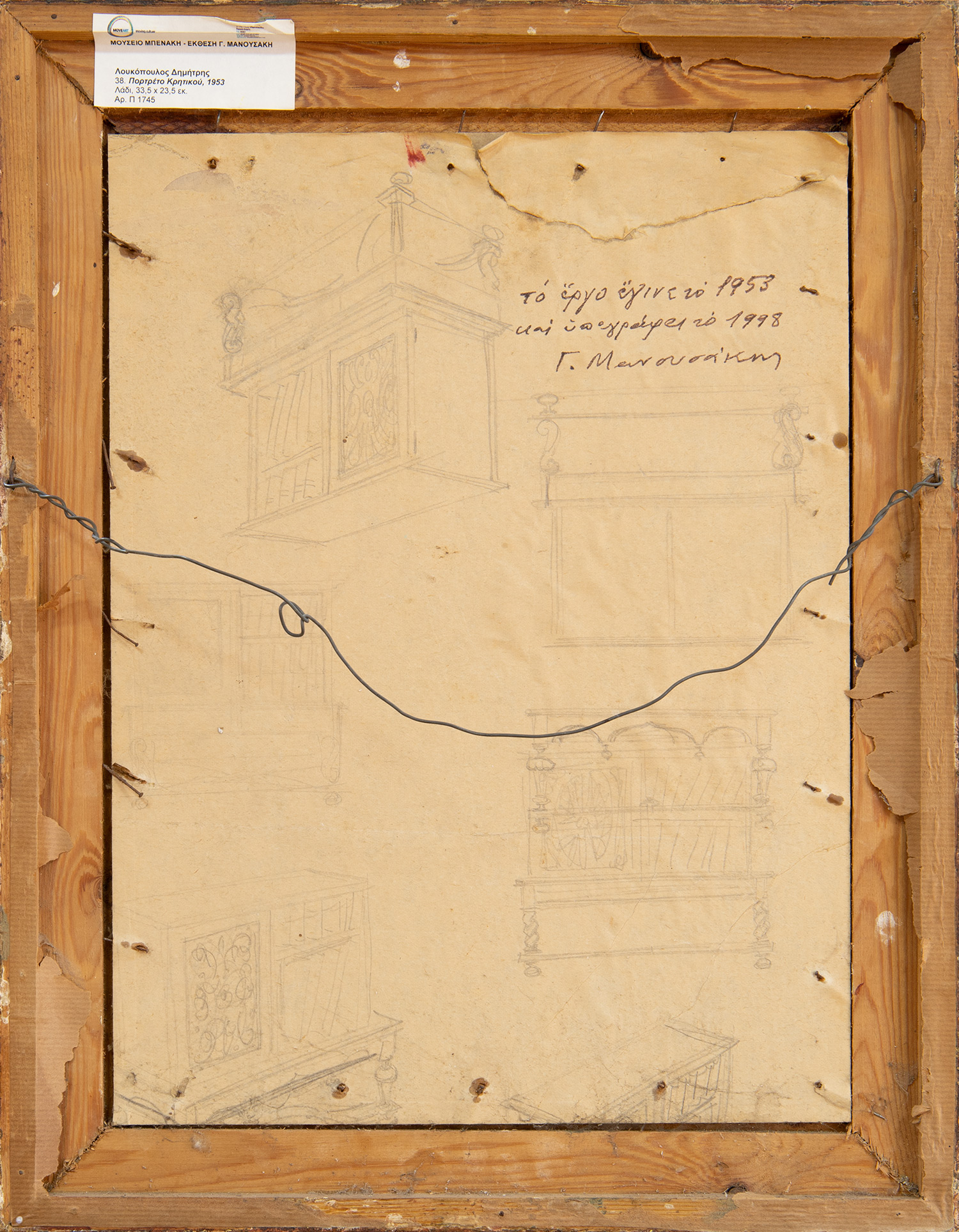 υπογεγραμμένο και χρονολογημένο κάτω δεξιά: Γ. Μανουσάκης / 1953 με σημείωμα του καλλιτέχνη στο πίσω μέρος.
