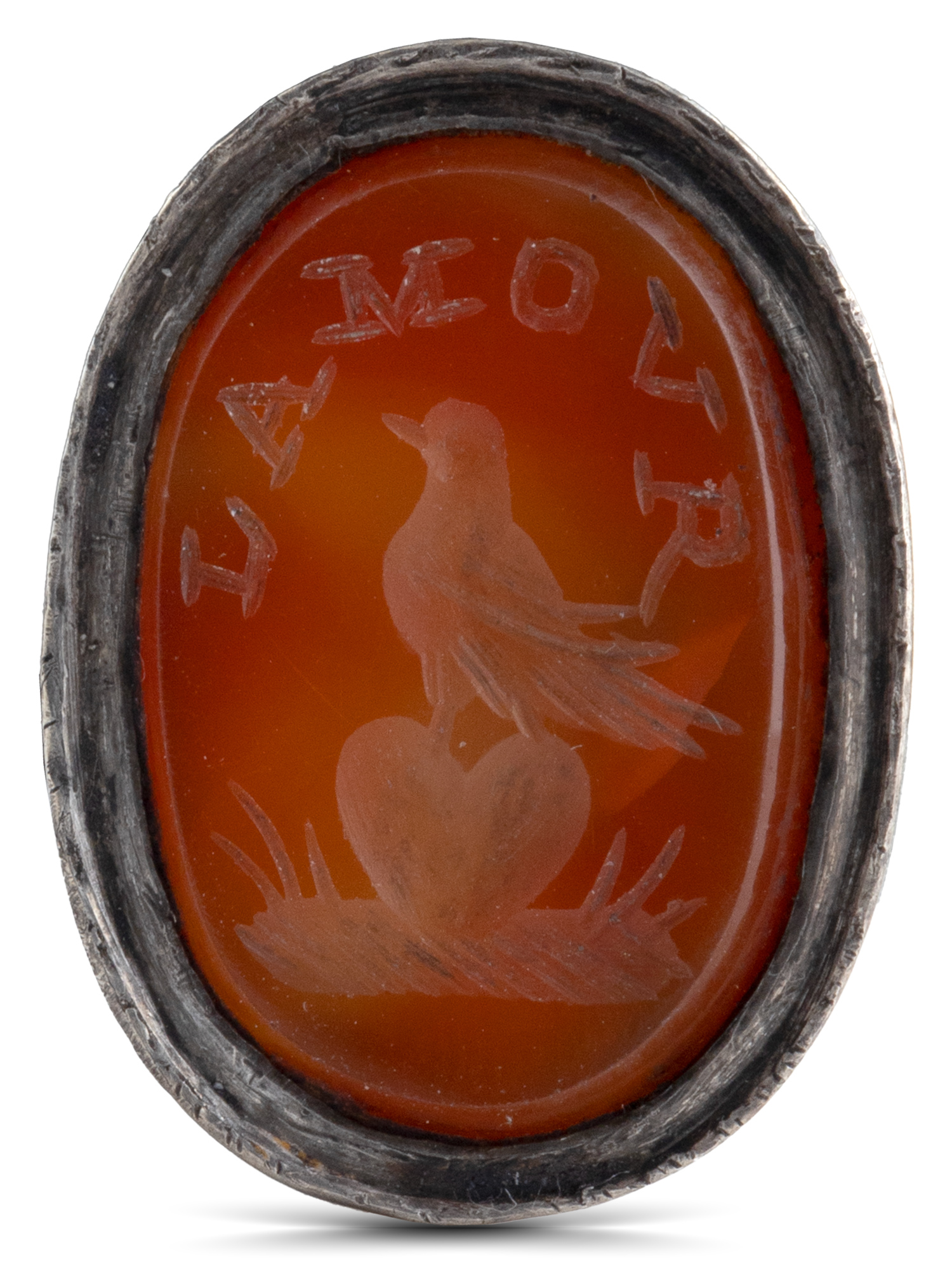 Στη βάση φέρει παράσταση πουλιού πάνω σε καρδιά και την επιγραφή: L’ AMOUR