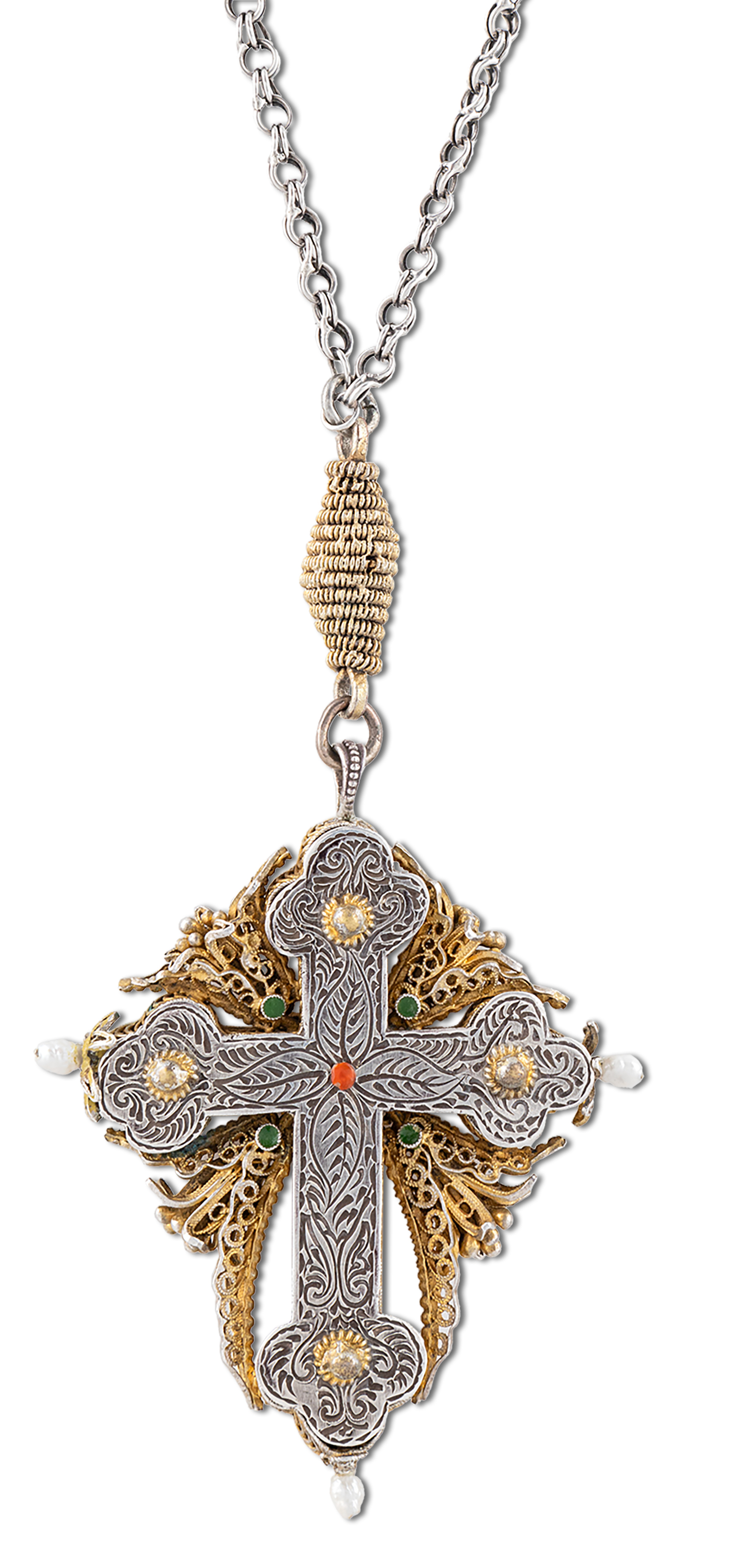 Τιμή εκτίμησης: € 3.000 - 4.000Επιστήθιος σταυρός «φυλακτό», φιλοτεχνημένος με συρματερή διάτρητη τεχνική (φιλιγκράν) και διακοσμημένος με κοραλλένιες πέτρες, μαργαριτάρια και σμάλτα.