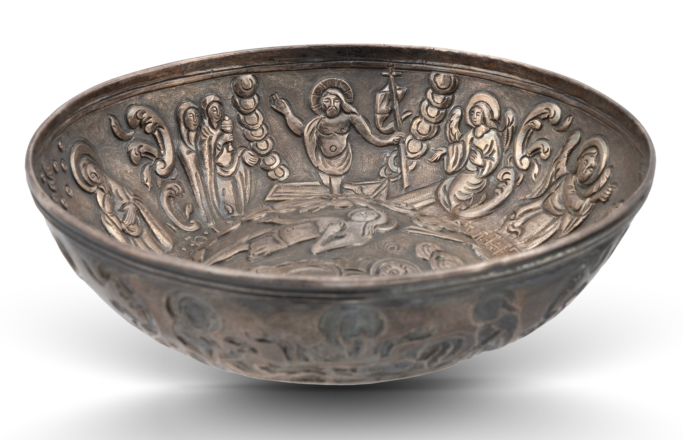 Πλούσιος σφυρήλατος, σκαλιστός διάκοσμος. Στον ομφαλό παράσταση της βάπτισης του Ιησού. Περιμετρικά της εσωτερικής πλευράς σκηνές από τον Ευαγγελισμό της Θεοτόκου, τη Γέννηση, την Αποκαθήλωση και την Ανάσταση του Ιησού. Φέρει επιγραφή «ΧΑΤΖΙΕΥΔΟΚΙΑC: XATZIKωΝCΤΑΝΤΗΝΟC: ΑωΙ (=1810) ΜΑΡΤΙω ..».