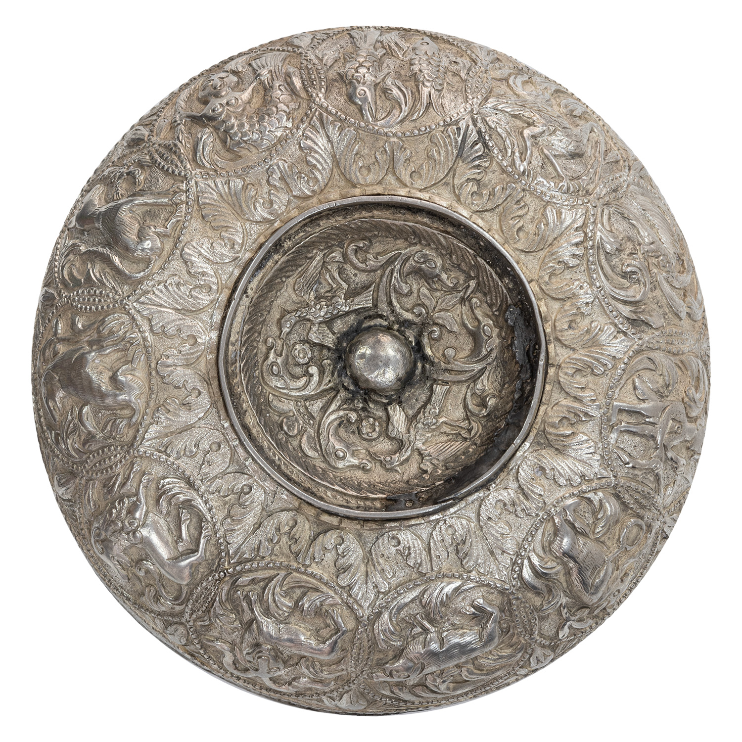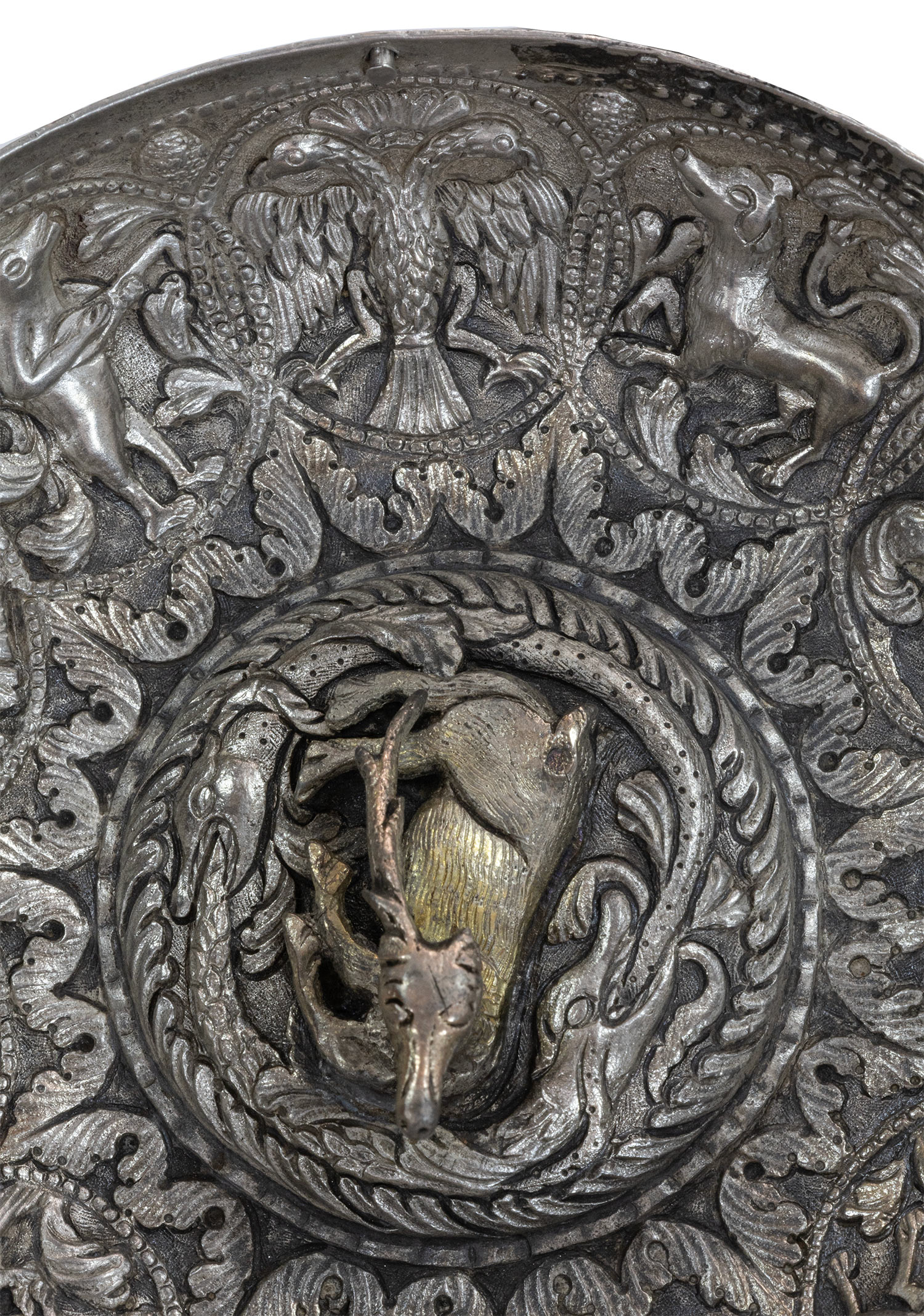 Τιμή εκτίμησης: € 6.000 - 8.000Πρόκειται για σπάνιο δείγμα διπλού κυπέλλου, όπου το κάτω τάσι βιδώνει στο πάνω ώστε να αποτελούν ένα σώμα. Πλούσιος σφυρήλατος, σκαλιστός διάκοσμος. Στον ομφαλό ολόγλυφο καθιστό αρσενικό ελάφι που περιβάλλεται από φιδόμορφους δράκοντες.