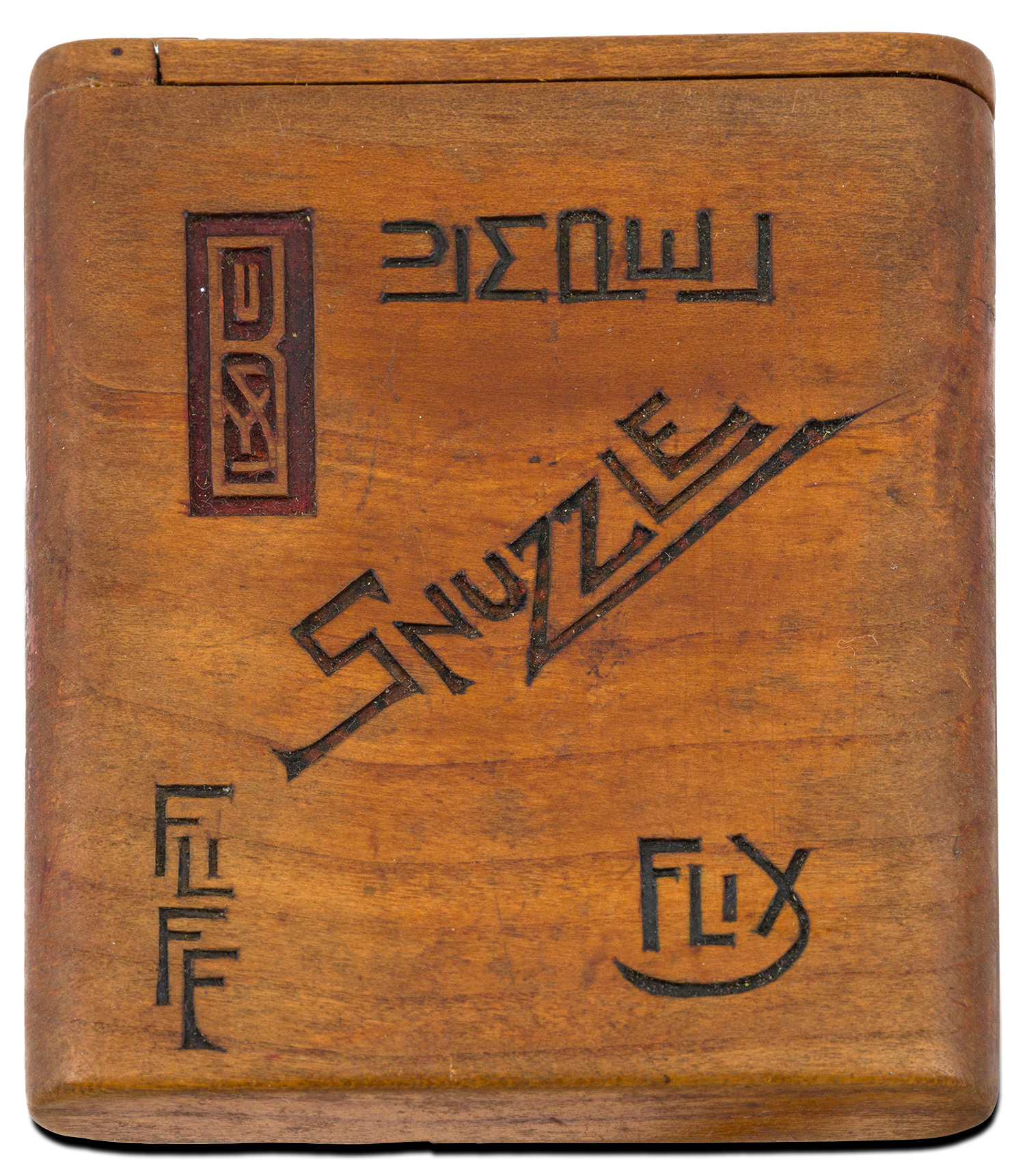 Τιμή εκτίμησης: € 400 - 600Σχήμα πλακέ με χαραγμένες στα αγγλικά χιουμοριστικές λέξεις: FLIX, PUSSY, LOUPI, ZNUZZLE, LUMPEL κ.ά.