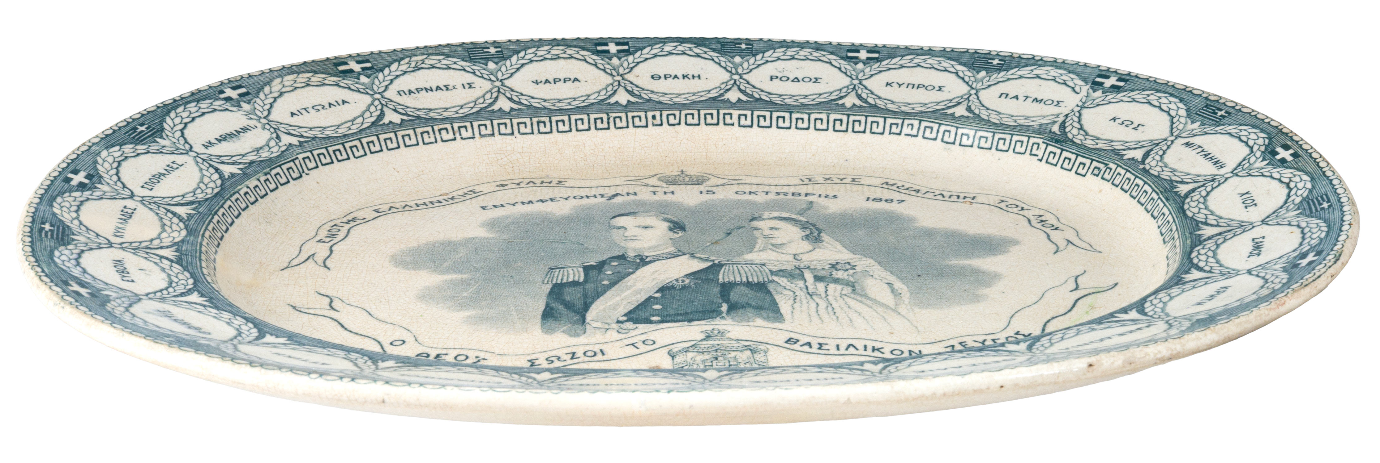 Αναμνηστική οβάλ πιατέλα για τους γάμους Γεωργίου και Όλγας (Αγγλία, για τους αδελφούς Καλοκαιρινού στη Σύρο, c. 1868)