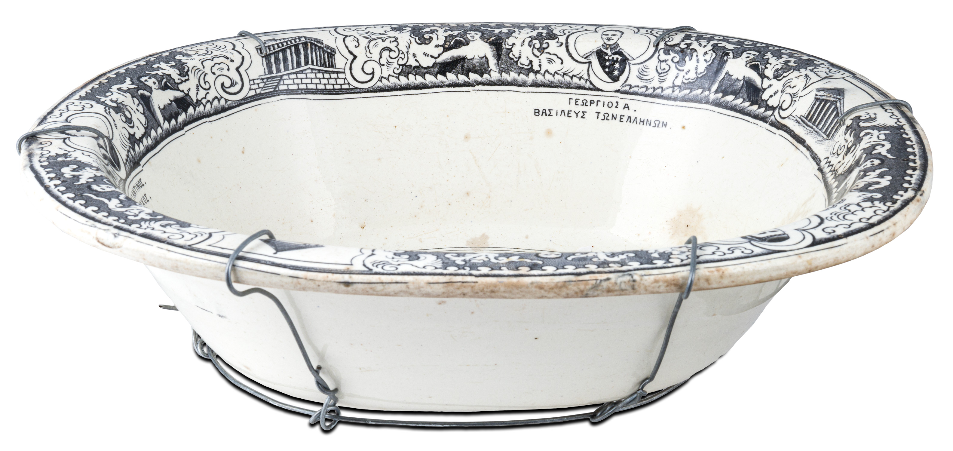Στο χείλος περιμετρικά σταυροειδή μετάλλια με πορτρέτα του βασιλιά Γεωργίου, της Βασίλισσας Όλγας και του Διαδόχου Κωνσταντίνου, ανάμεσα σε μορφές αγγέλων και αρχαίους ναούς.