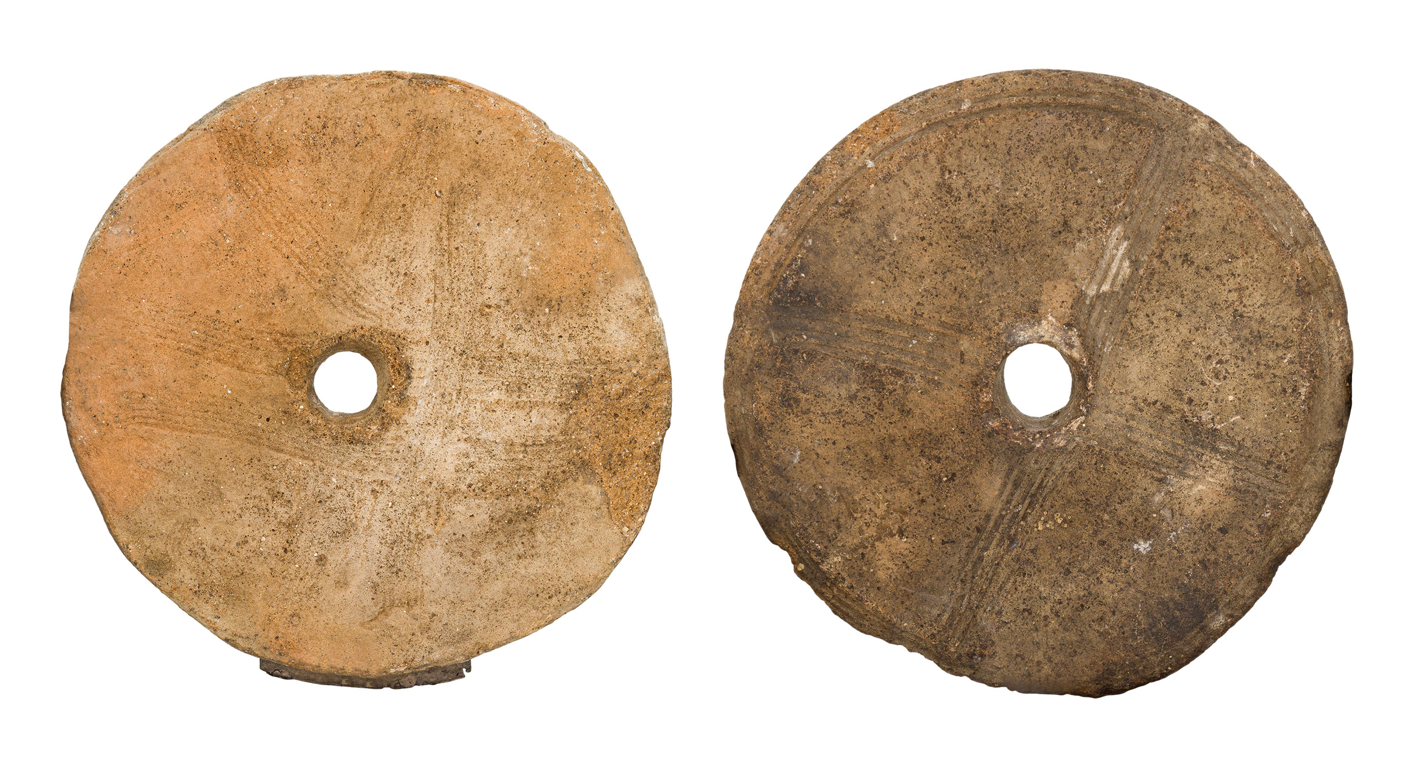 Εγχάρακτος σταυροειδής διάκοσμος με οδοντωτή γλυφίδα στο ένα και ασύμμετρος γραμμωτός διάκοσμος στο άλλο. διάμετρος: 29 και 24 εκ.