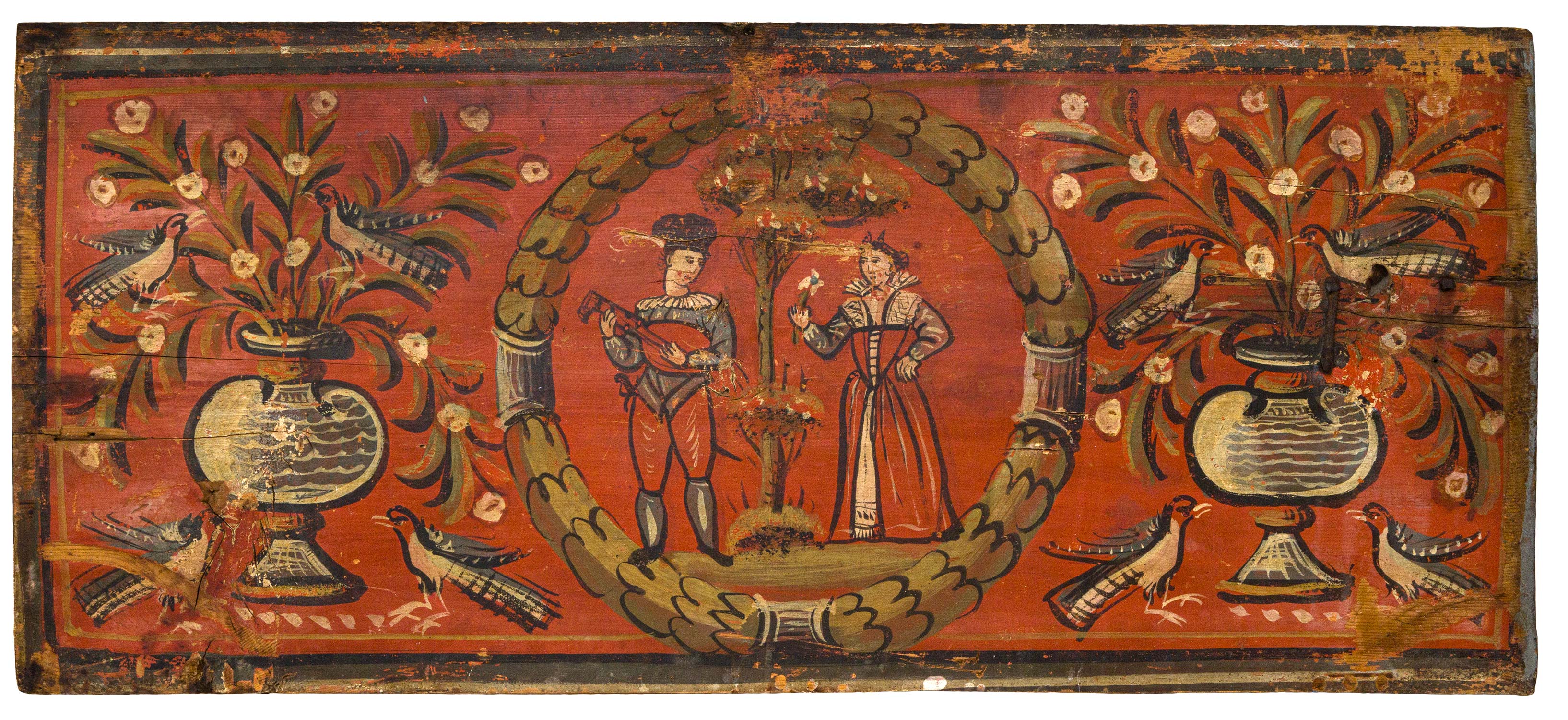 Τιμή εκτίμησης: € 3.000 - 4.000Από την ομάδα κασελών με ζωγραφιστό καπάκι και εμφανείς δυτικές επιρροές που βρέθηκαν στα Δωδεκάνησα. Σε έντονο κόκκινο φόντο απεικονίζεται ζευγάρι με αναγεννησιακές «βενετσιάνικες» ενδυμασίες, χαρακτηριστικές του β´ μισού του 16ου αιώνα.