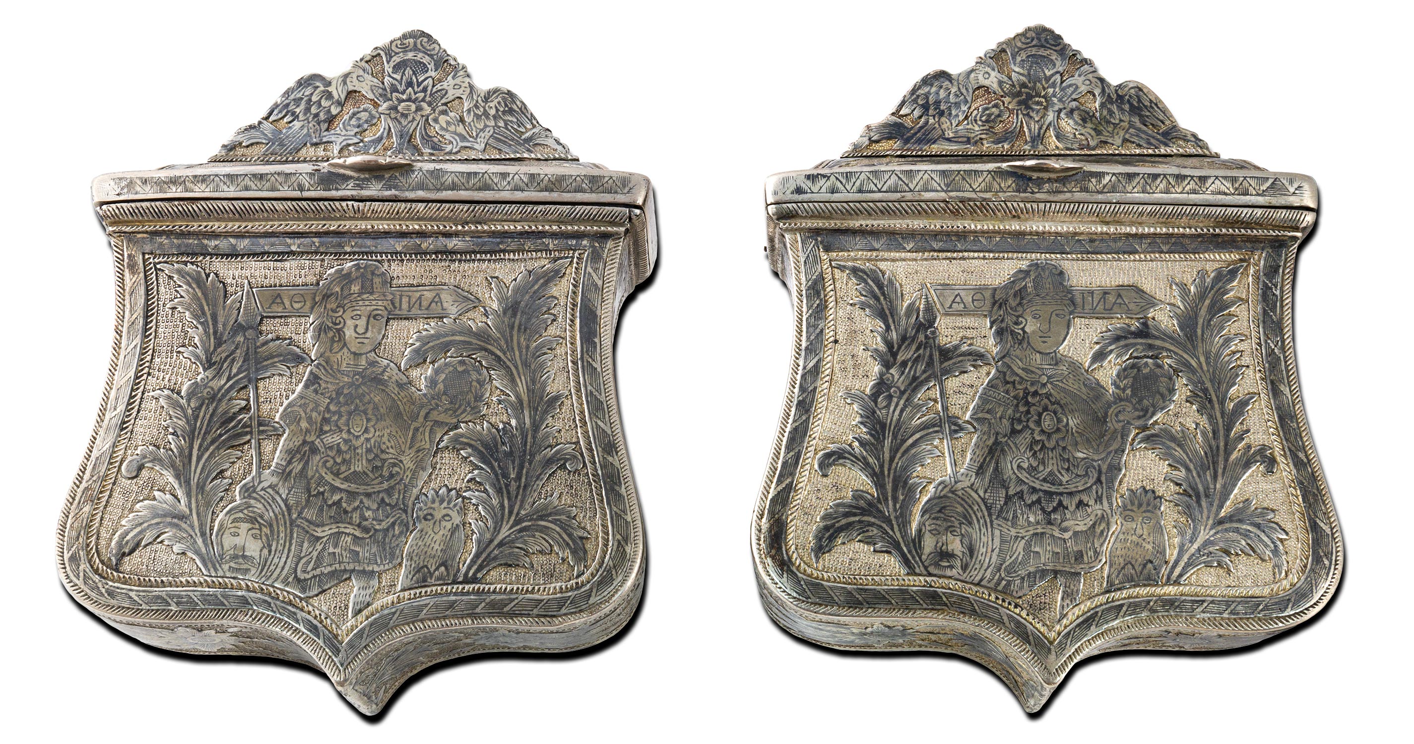 Ζευγάρι ασημένιες παλάσκες με παράσταση της Θεάς Αθηνάς (τέλος 18ου-αρχές 19ου α...