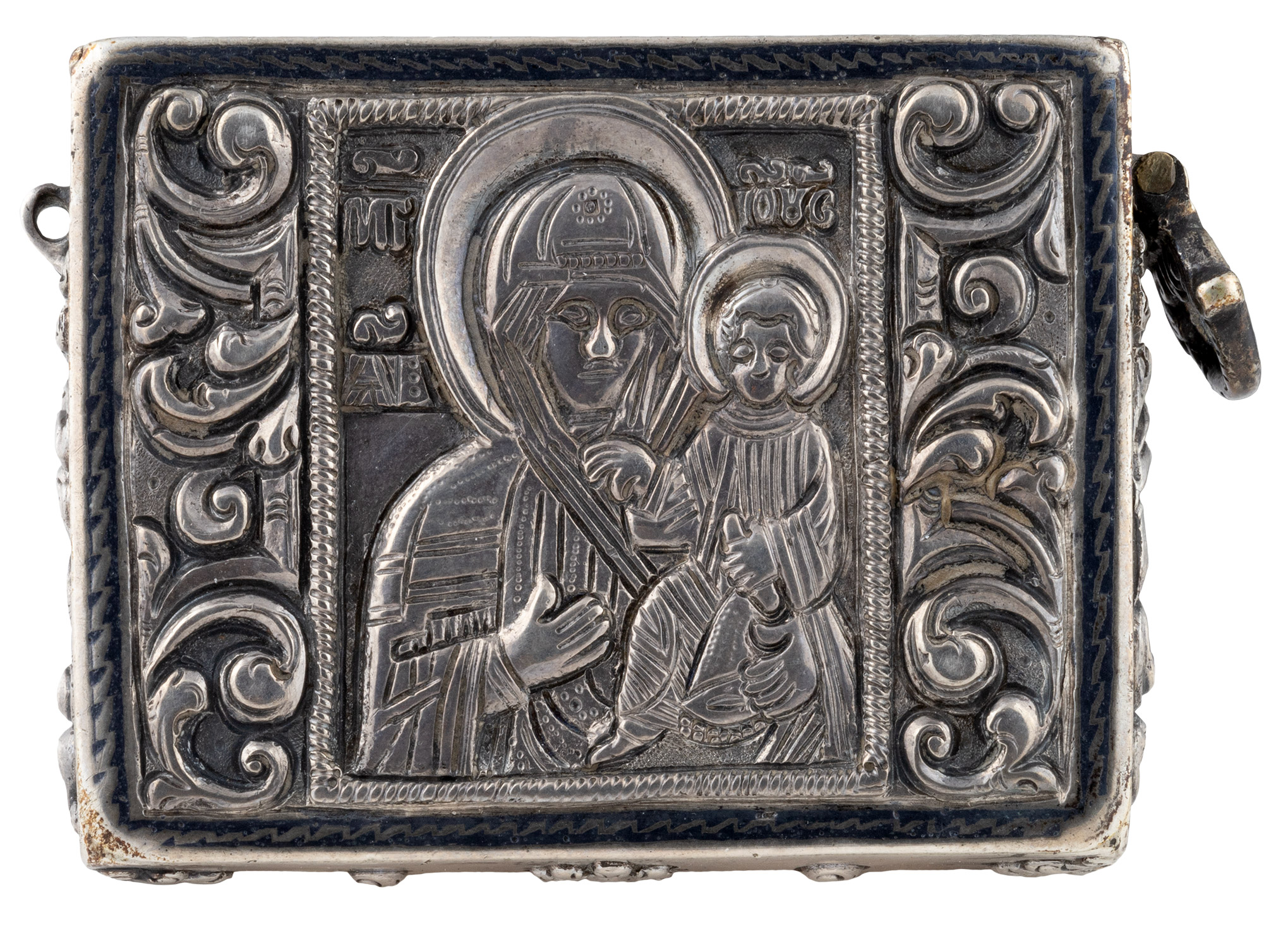 Στην εμπρόσθια όψη σφυρήλατος, φουσκωτός διάκοσμος με παράσταση της Παναγίας Βρεφοκρατούσας.