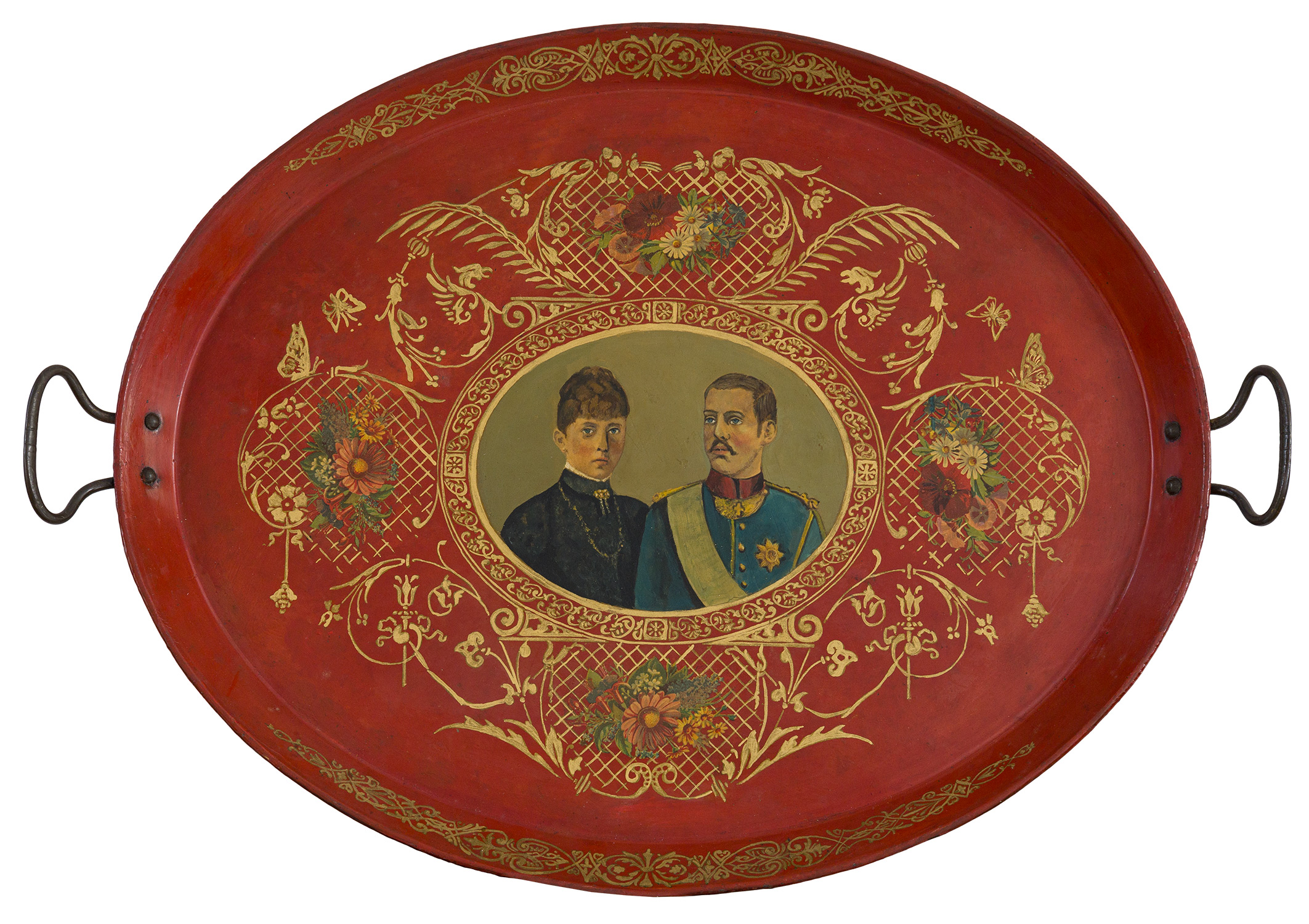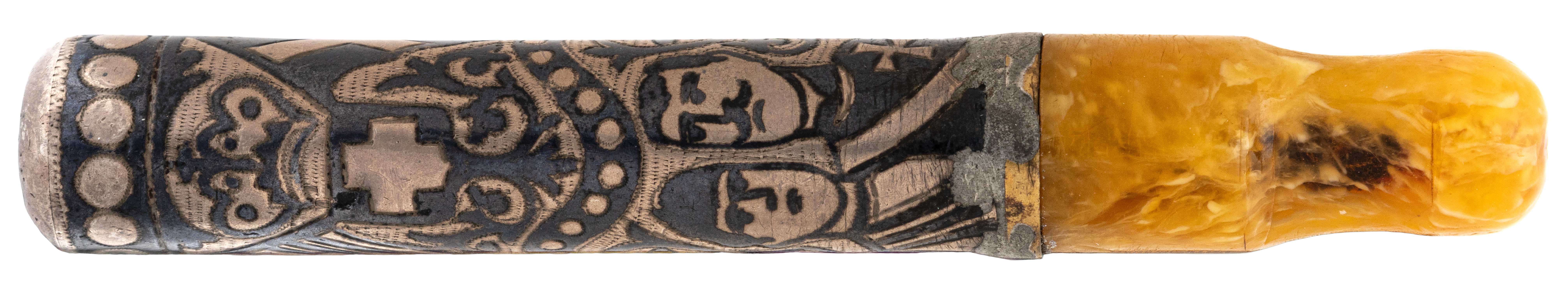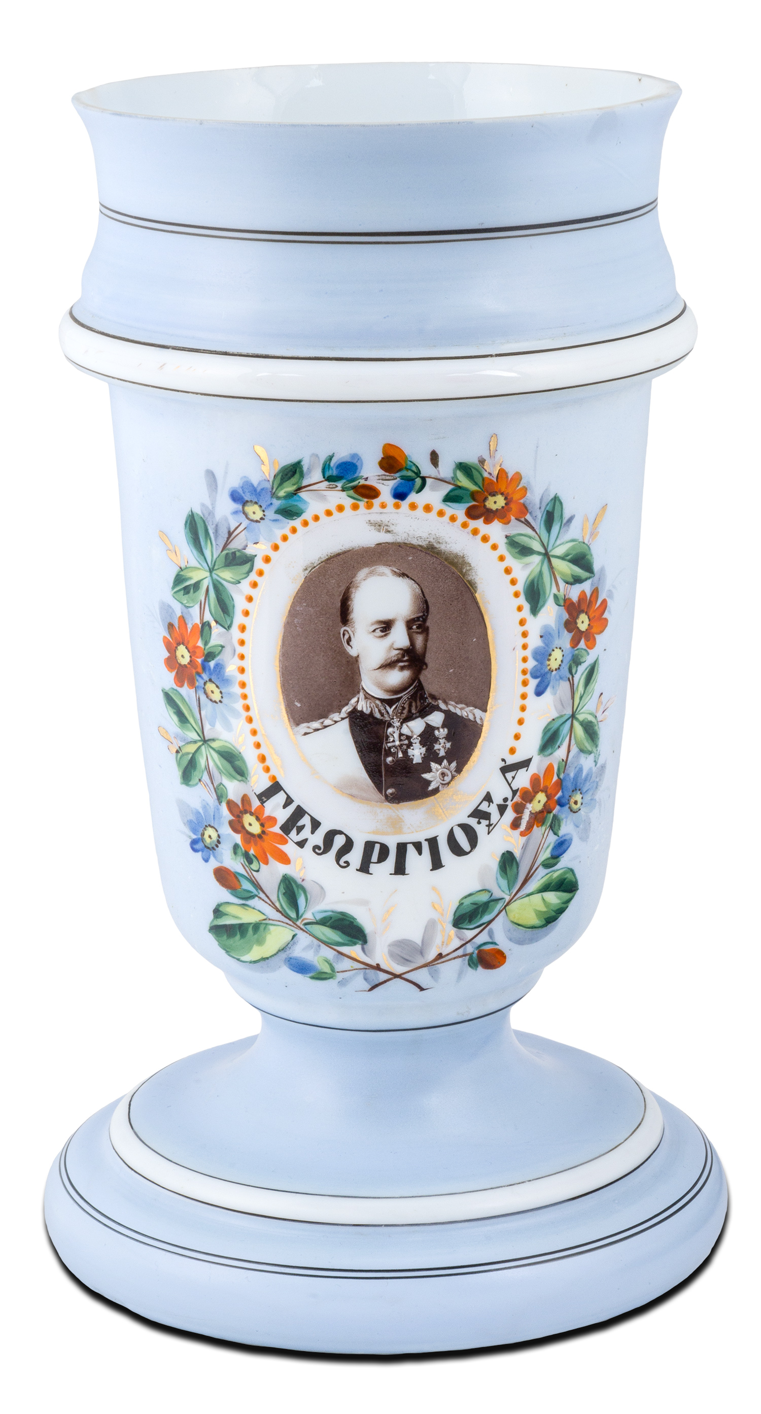 Περιμετρικά παραστάσεις του Κωνσταντίνου ως αρχιστράτηγου των Βαλκανικών Πολέμων και του βασιλικού ζεύγους φιλοτεχνημένες με σαβάτι. Επιστόμιο από κεχριμπάρι.