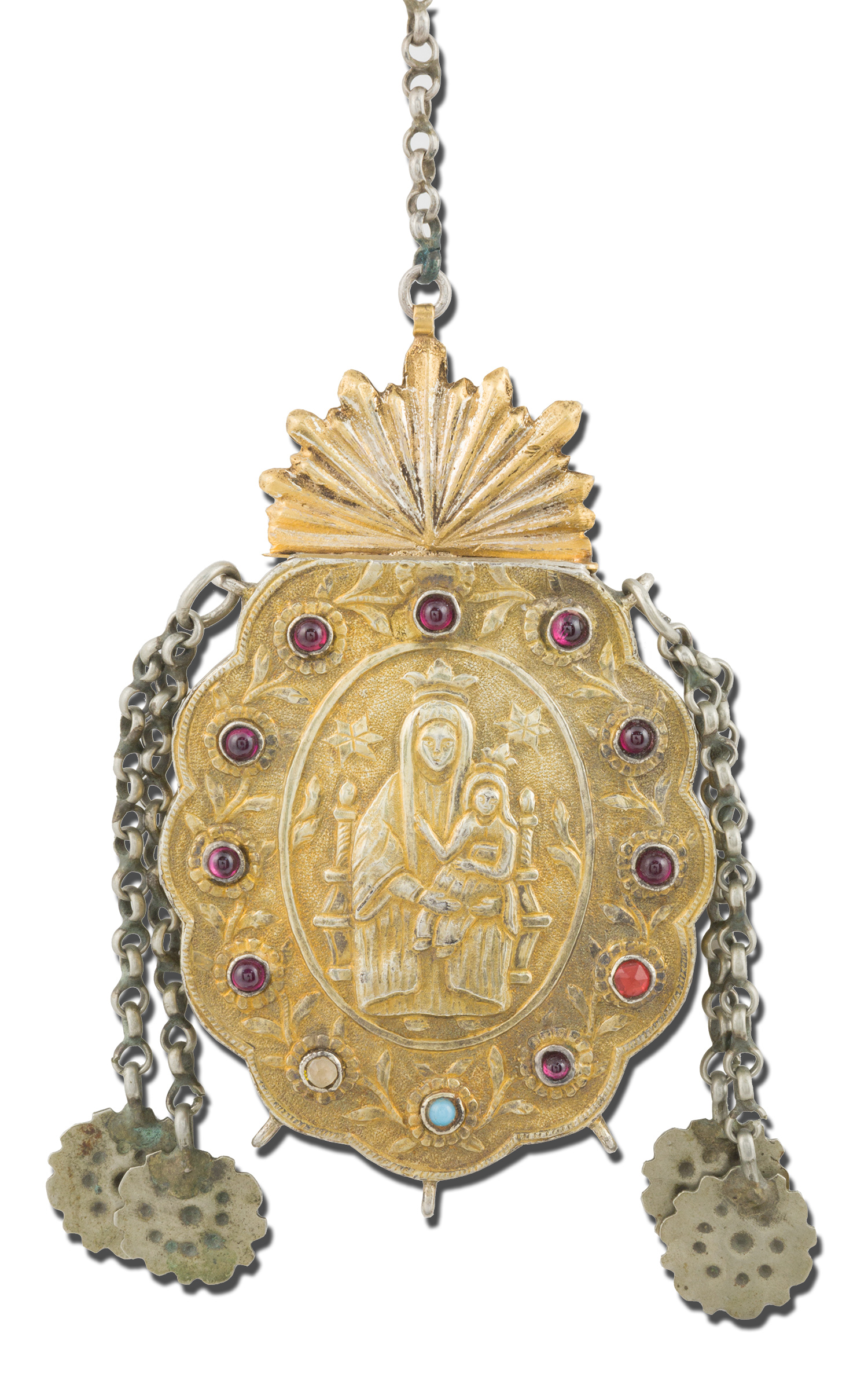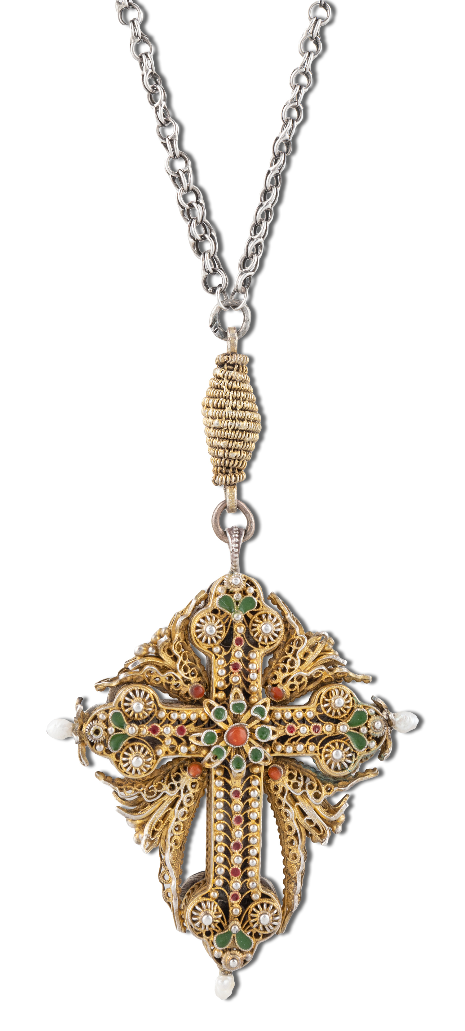 Επιστήθιος σταυρός «φυλακτό», φιλοτεχνημένος με συρματερή διάτρητη τεχνική (φιλιγκράν) και διακοσμημένος με κοραλλένιες πέτρες, μαργαριτάρια και σμάλτα.