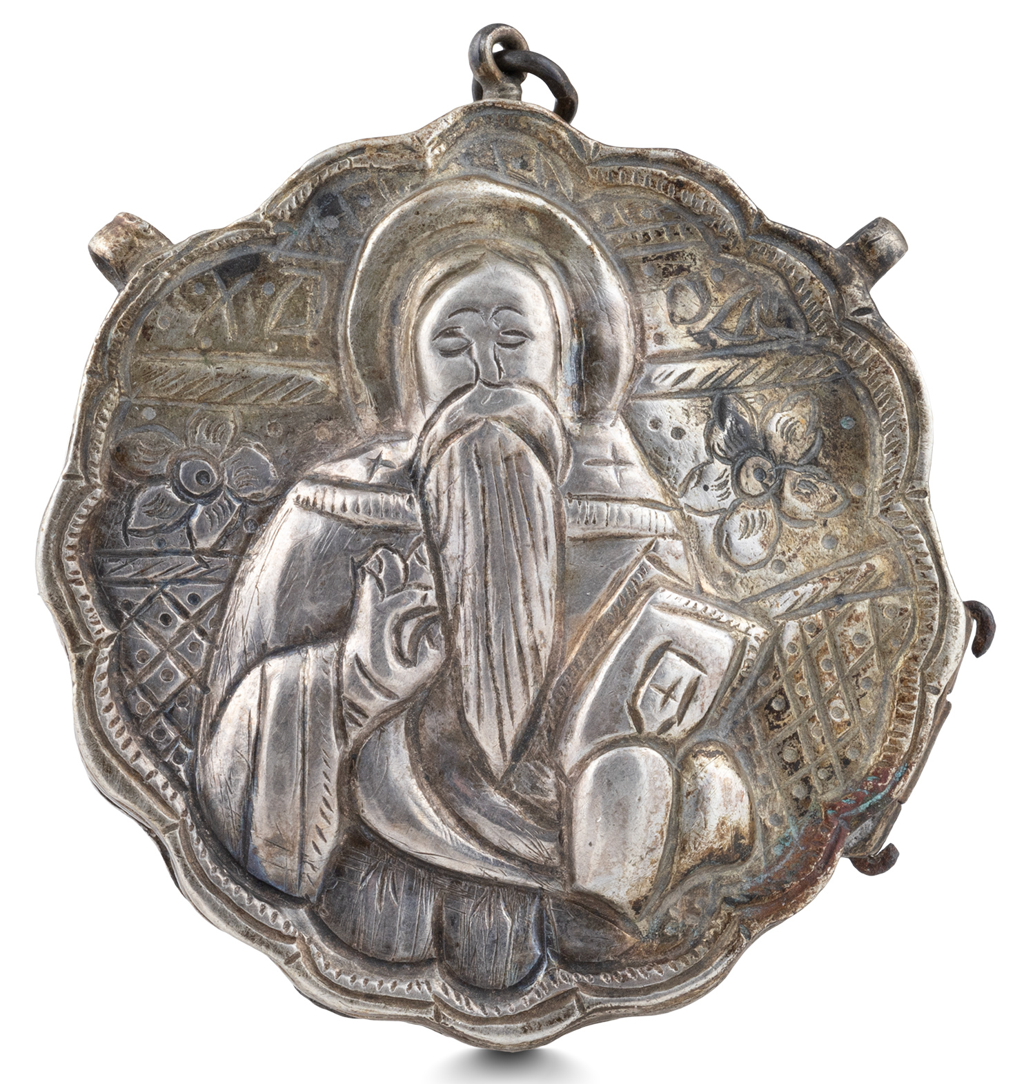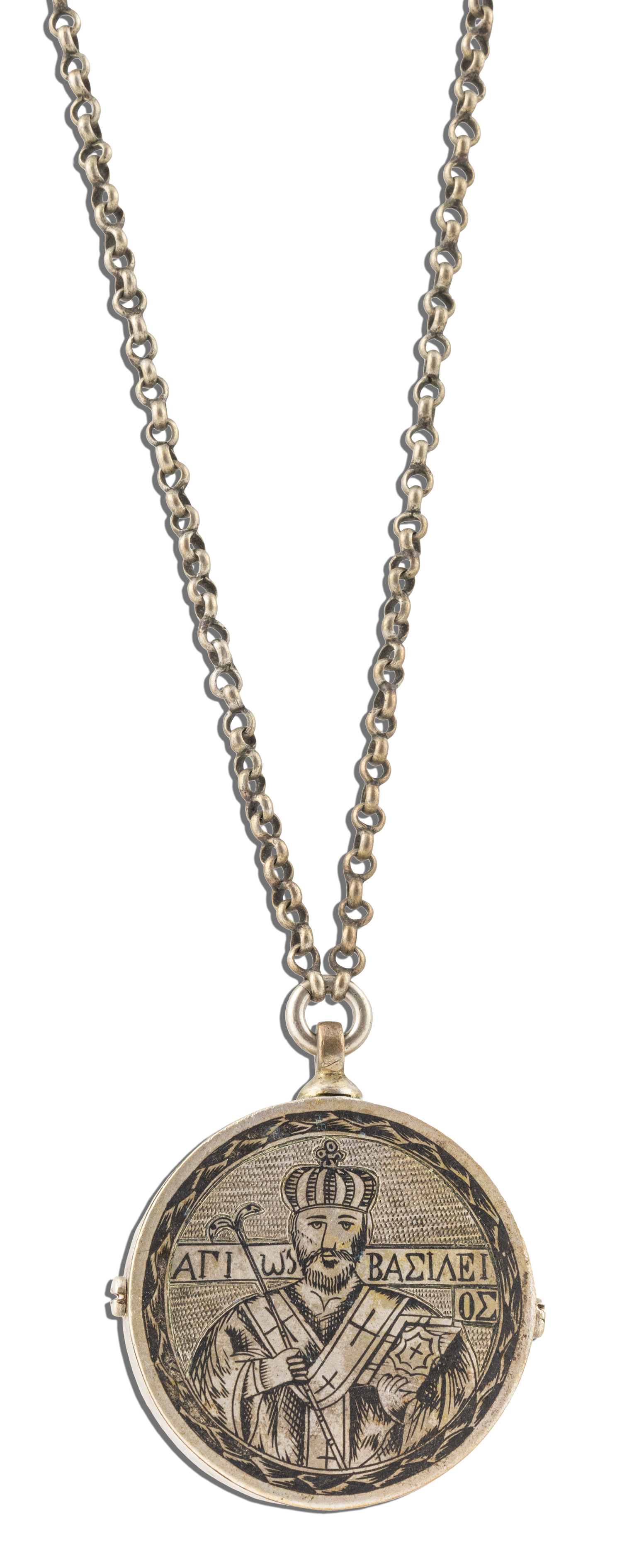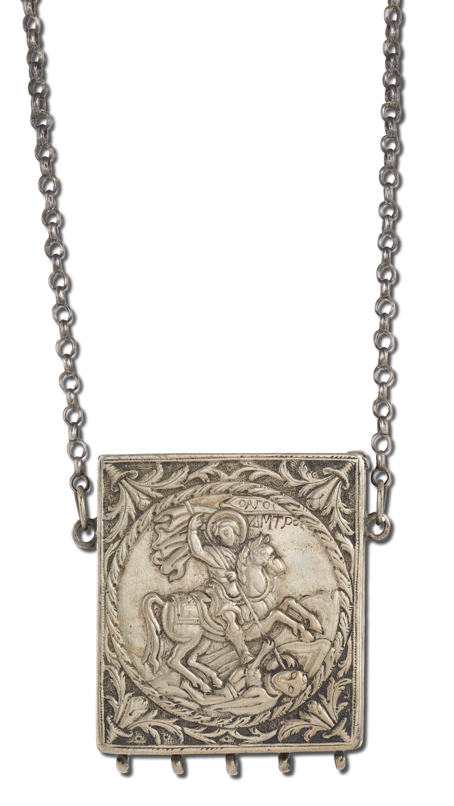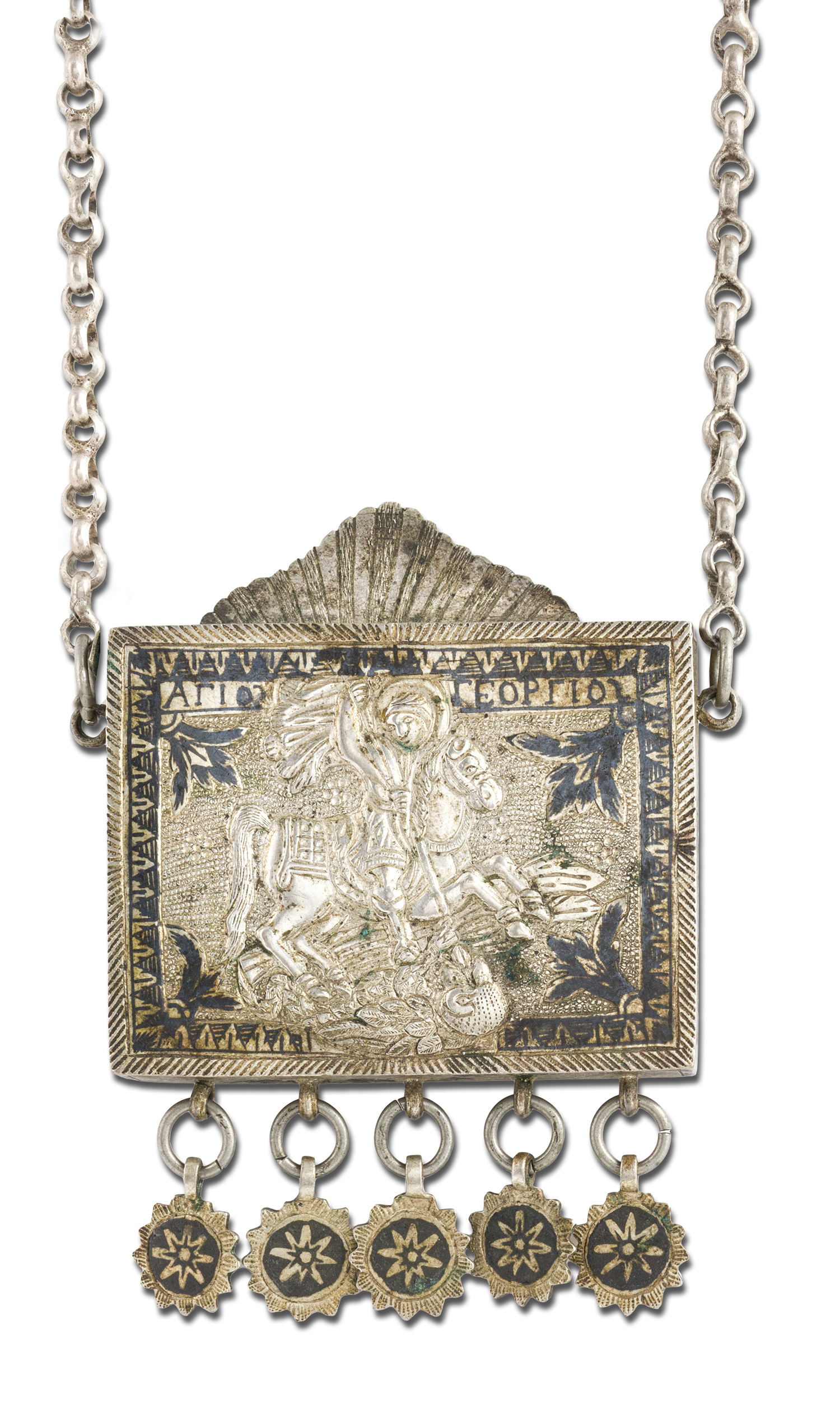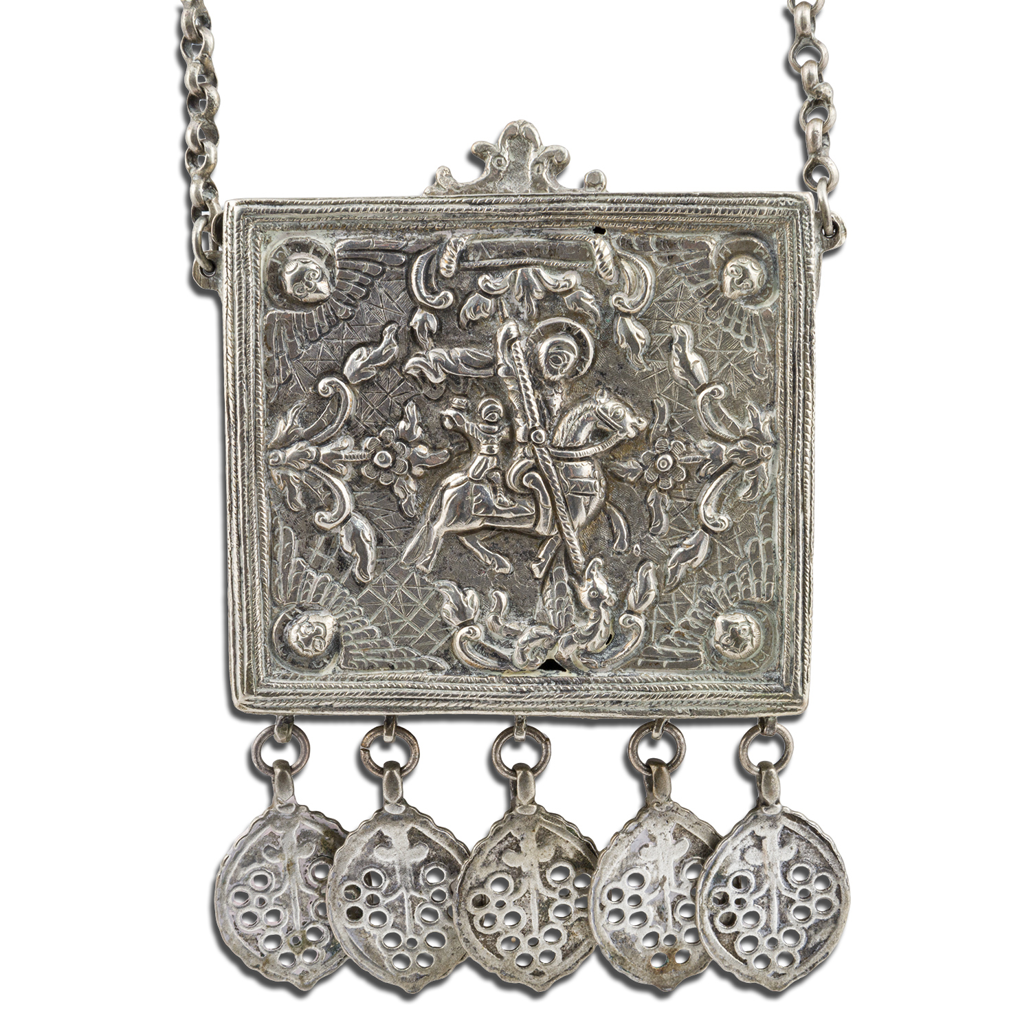 Στην εμπρόσθια όψη περίτεχνος σφυρήλατος διάκοσμος με παράσταση του έφιππου Αγίου Γεωργίου να λογχίζει τον δράκο. Περιμετρικά άνθινα και γεωμετρικά μοτίβα φιλοτεχνημένα με σαβάτι. Στην άλλη όψη εγχάρακτος σταυρός. Φέρει κρεμασίδια με ακτινωτά σαβατλίδικα θέματα.