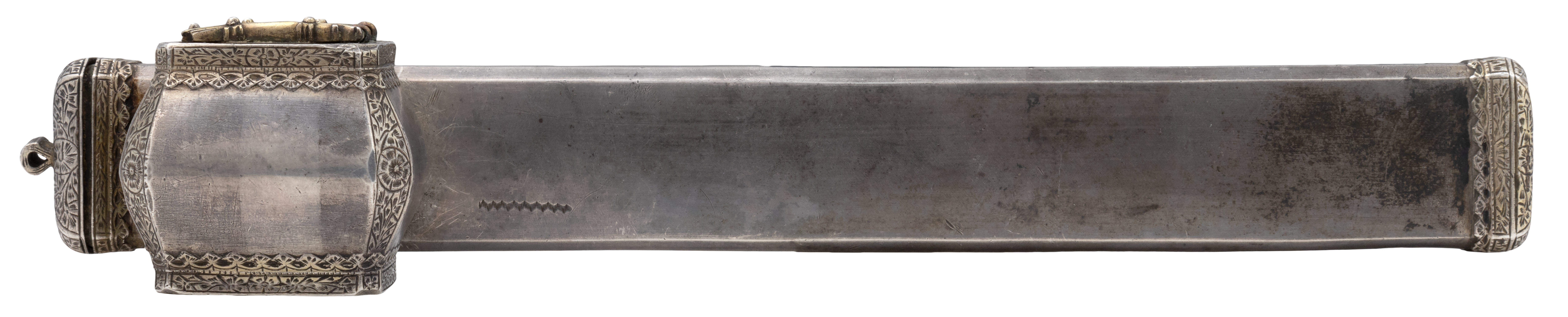 Φέρει οθωμανικούς τουράδες και σφραγίδα του κατασκευαστή. Στη βάση του μελανοδοχείου και στις άκρες της θήκης εγχάρακτη διακόσμηση με φυτικά μοτίβα.