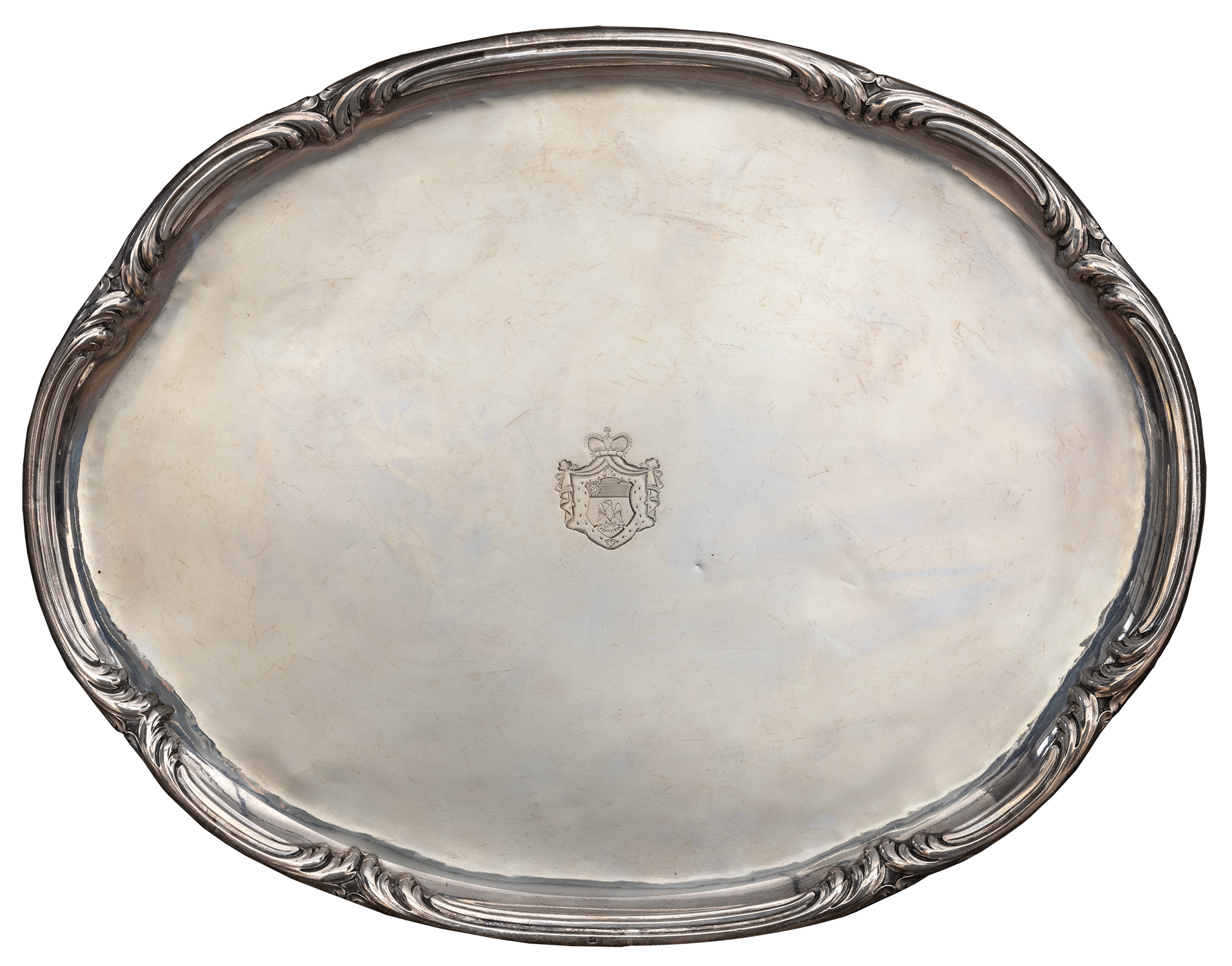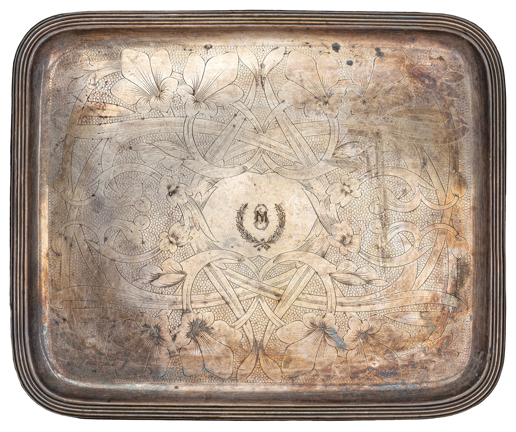 Στην εμπρόσθια πλευρά περίτεχνος εγχάρακτος άνθινος διάκοσμος με το μονόγραμμα του Μαυροκορδάτου στο κέντρο.