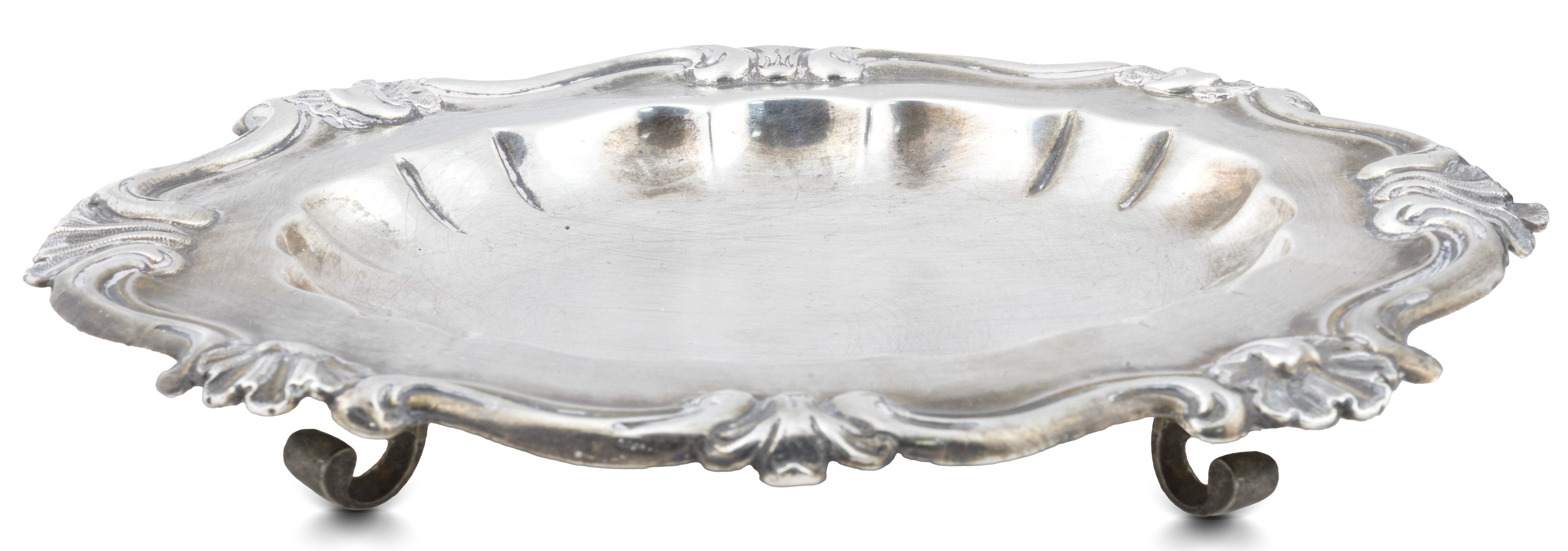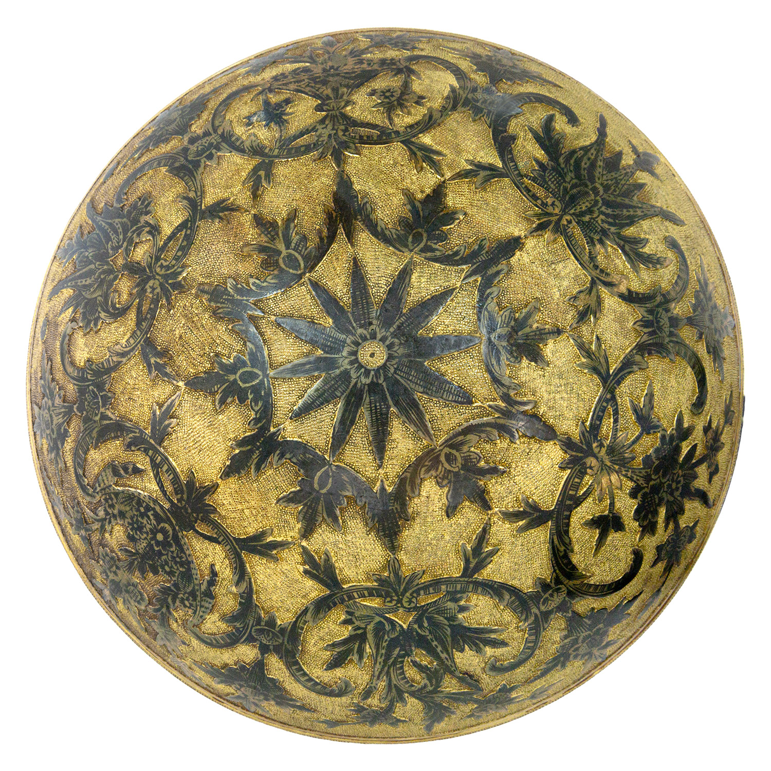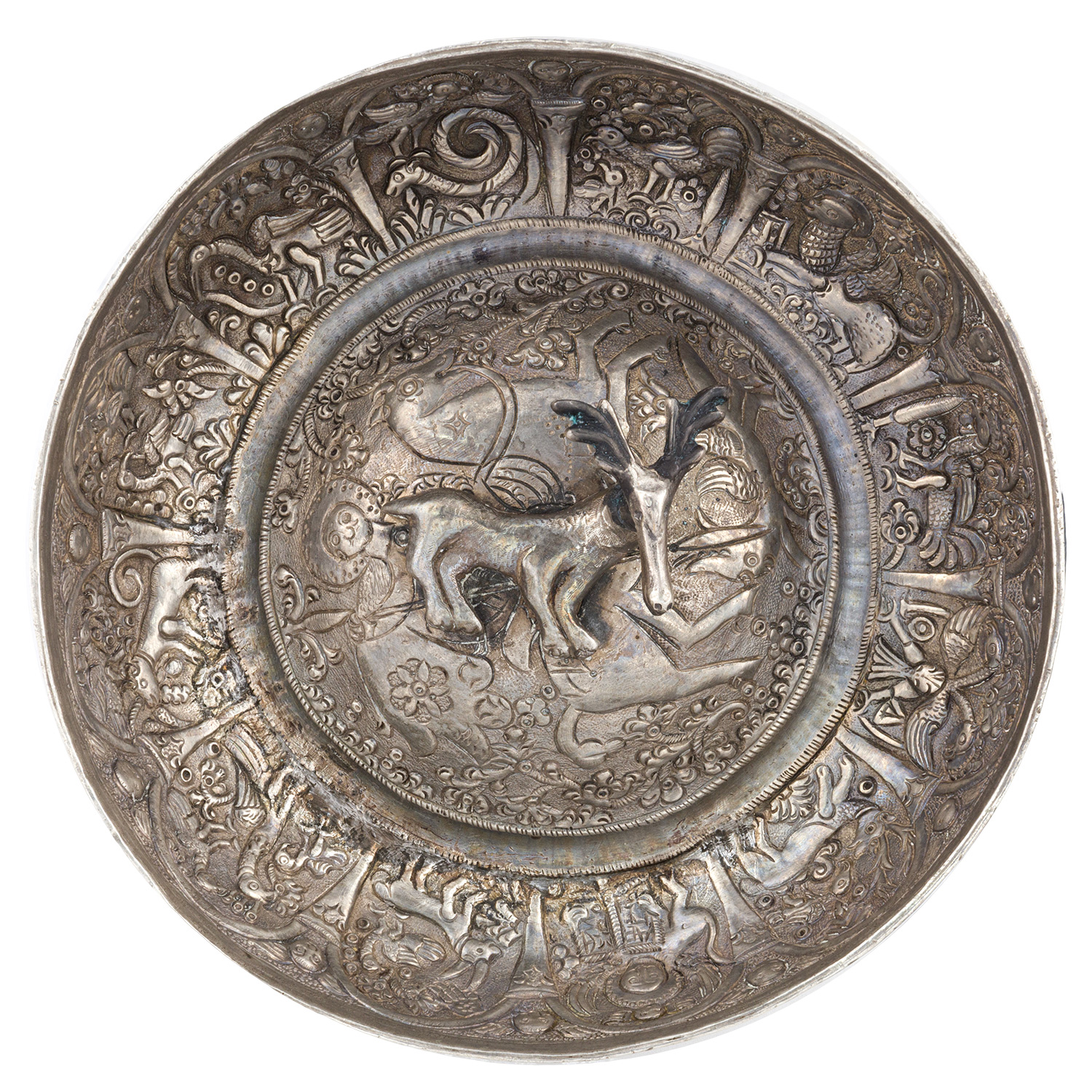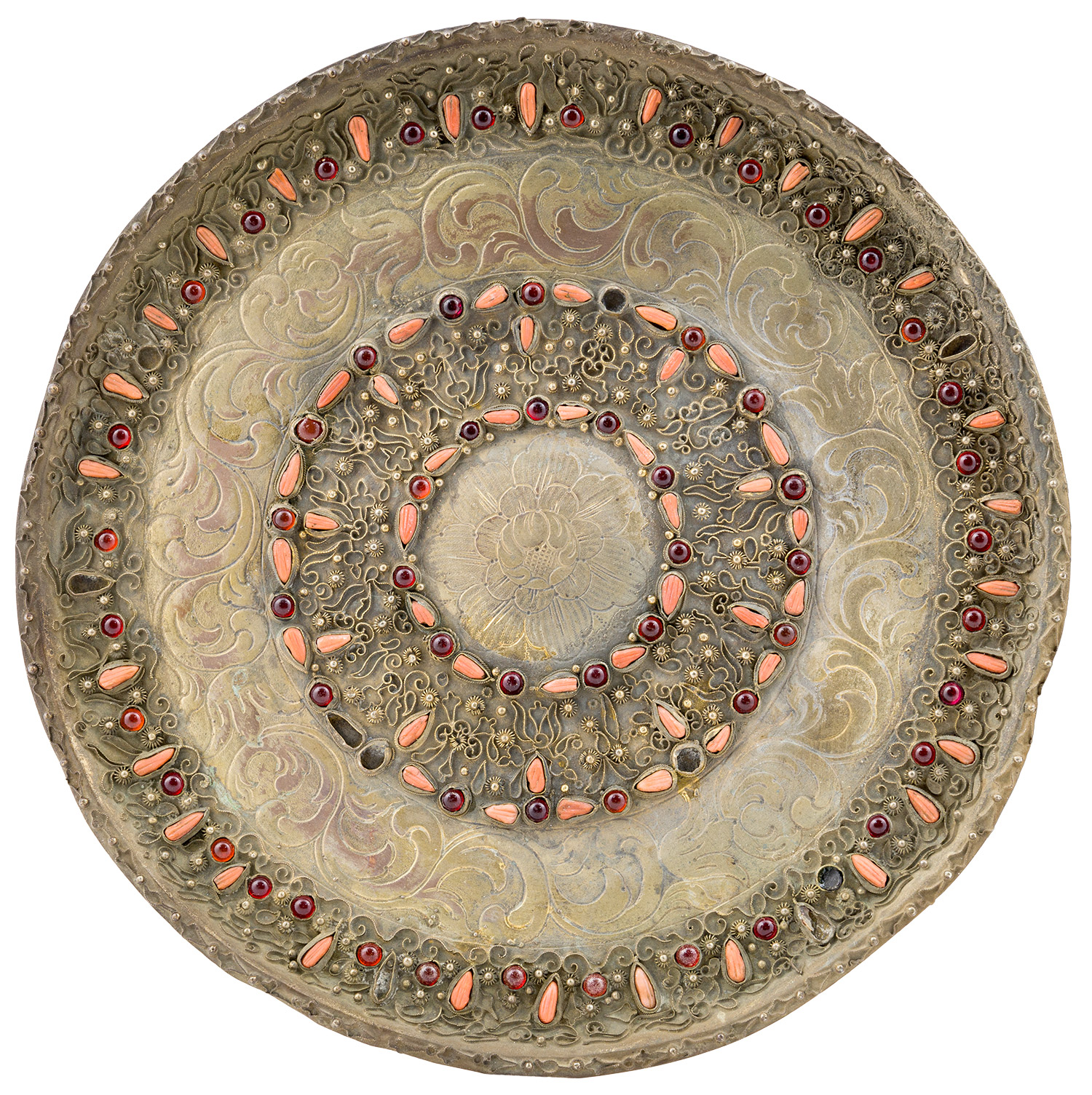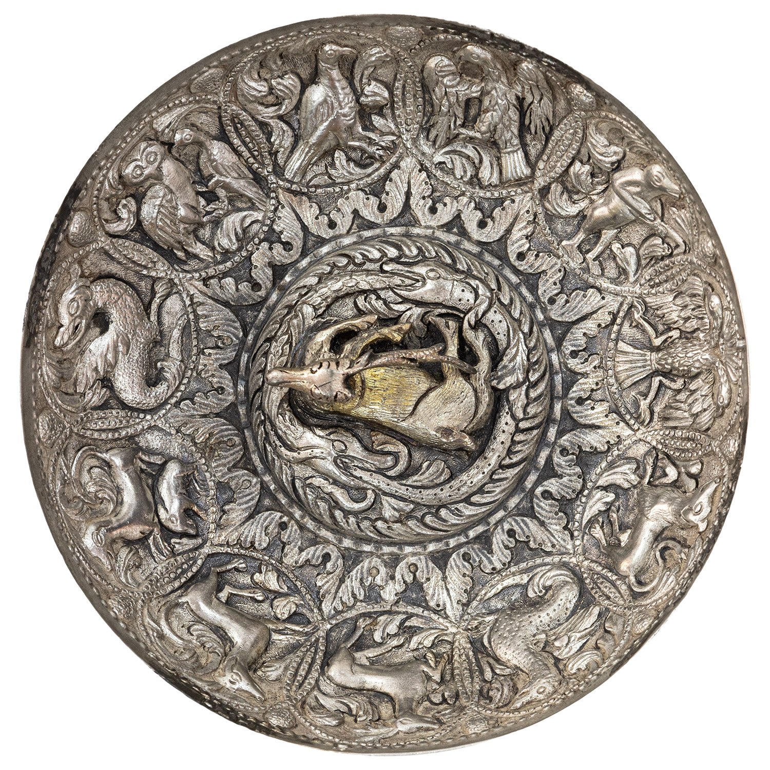 Πρόκειται για σπάνιο δείγμα διπλού κυπέλλου, όπου το κάτω τάσι βιδώνει στο πάνω ώστε να αποτελούν ένα σώμα. Πλούσιος σφυρήλατος, σκαλιστός διάκοσμος. Στον ομφαλό ολόγλυφο καθιστό αρσενικό ελάφι που περιβάλλεται από φιδόμορφους δράκοντες.