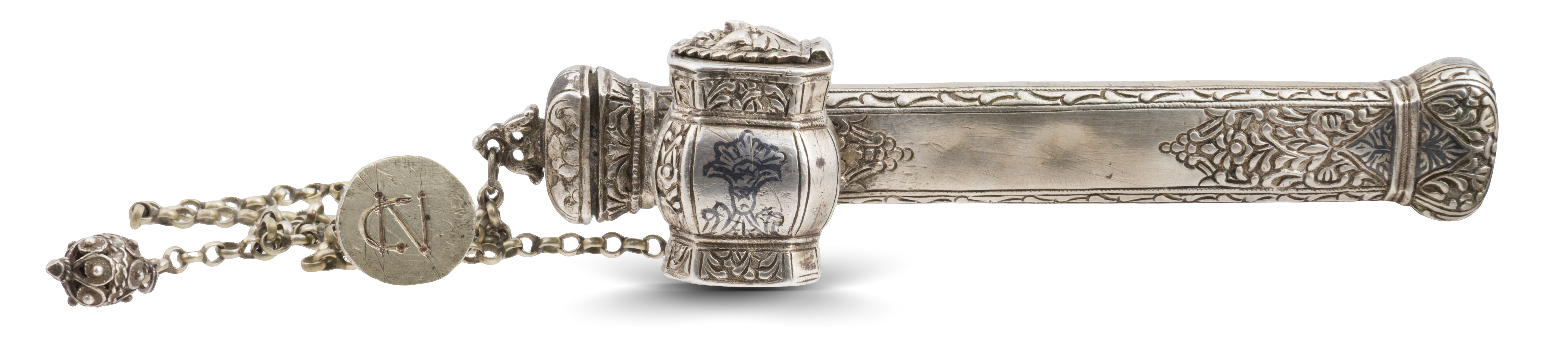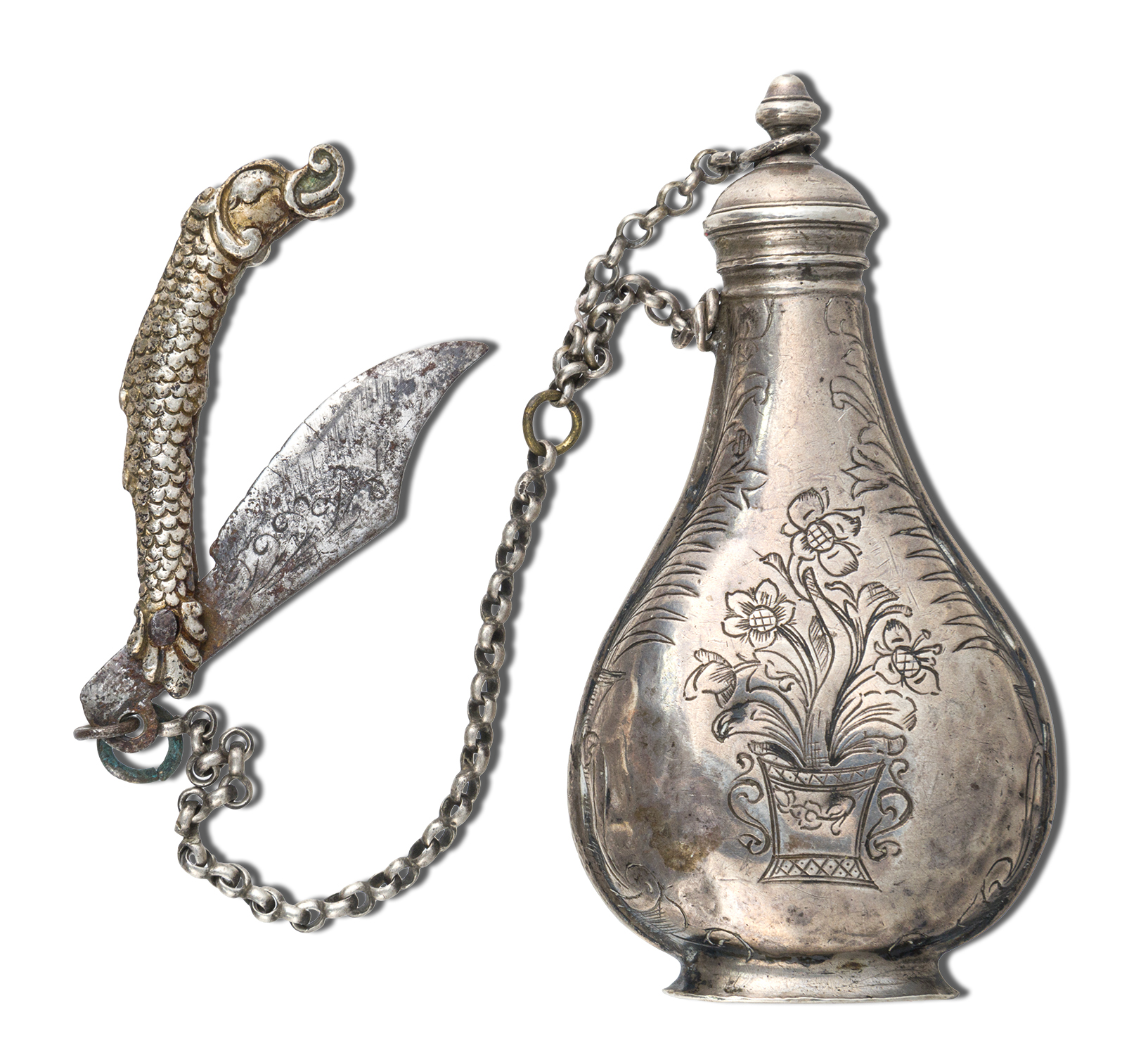 Μικρή αλυσίδα που καταλήγει σε σουγιά με ασημένια λαβή σε μορφή δράκου συνδέει το πώμα με το υπόλοιπο σώμα.
