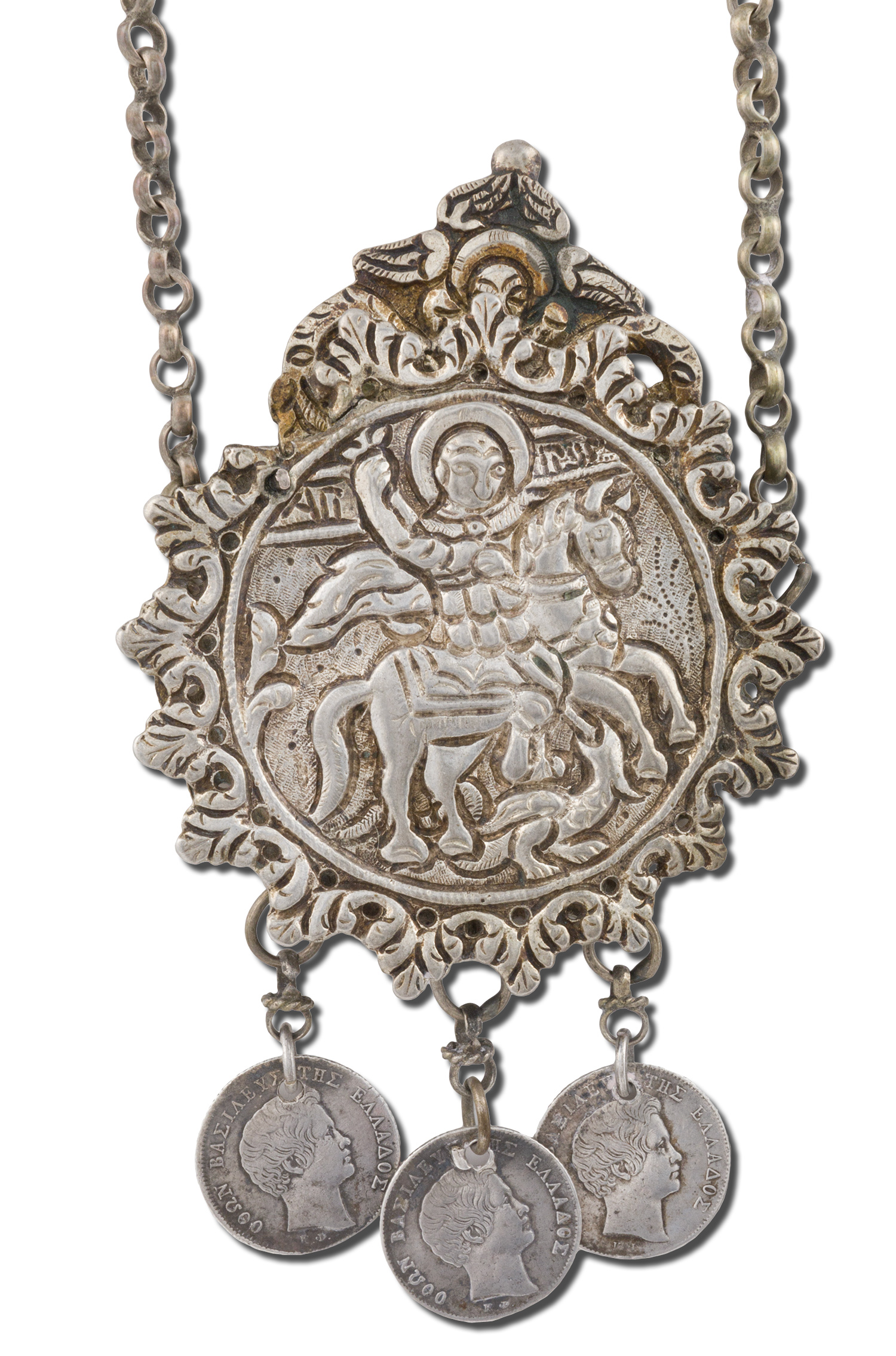 Στην εμπρόσθια όψη σφυρήλατος, φουσκωτός διάκοσμος με παράσταση τουαγίου Γεωργίου του Δρακοκτόνου. Στην άλλη πλευρά σπάνιος εγχάρακτος διάκοσμος με κυπαρίσσια και φαλλόσχημα μοτίβα (αρχαία σύμβολα της γονιμότητας και της βλάστησης) σε σχήμα σταυρού. Στην επίστεψη φτερωτό χερουβείμ. Φέρει ως κρεμασίδια τρία ασημένια νομίσματα με τη μορφή του Όθωνασε νεαρή ηλικία (1/4 της δραχμής του 1833).