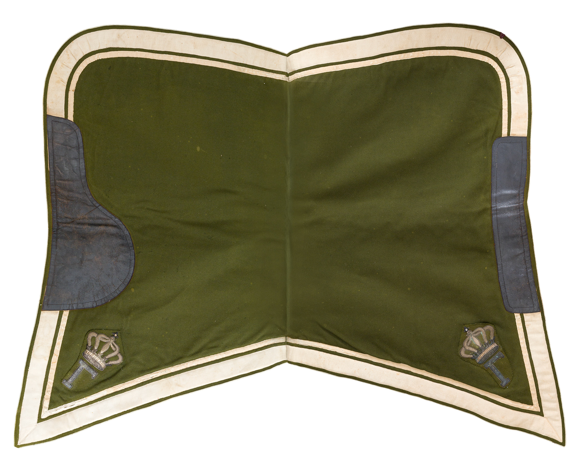 Αμφίπλευρα στις πίσω άκρες φέρει στέμματα και το αρχικό γράμμα Γ του ονόματος του βασιλιά κεντημένα με αργυρόνημα.