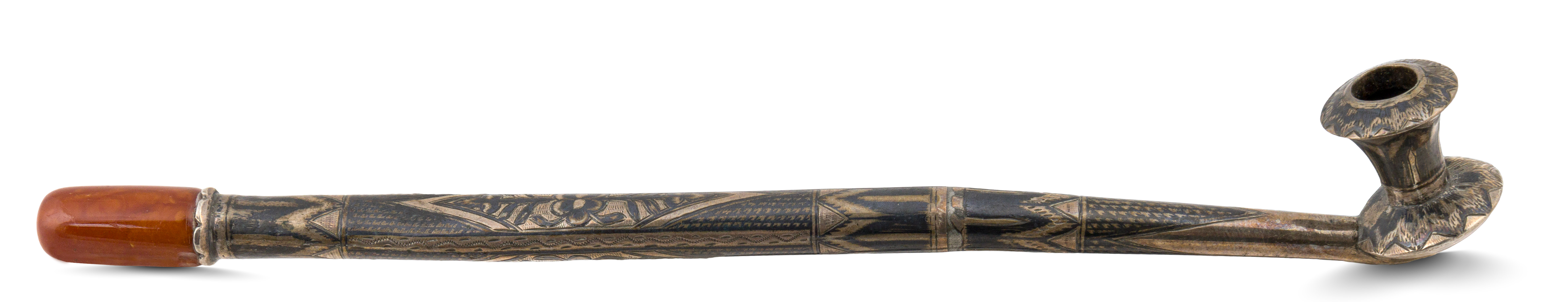 Στο στέλεχος (σωλήνα) και το κύπελλο καπνού άνθινα και γεωμετρικά μοτίβα φιλοτεχνημένα με σαβάτι.